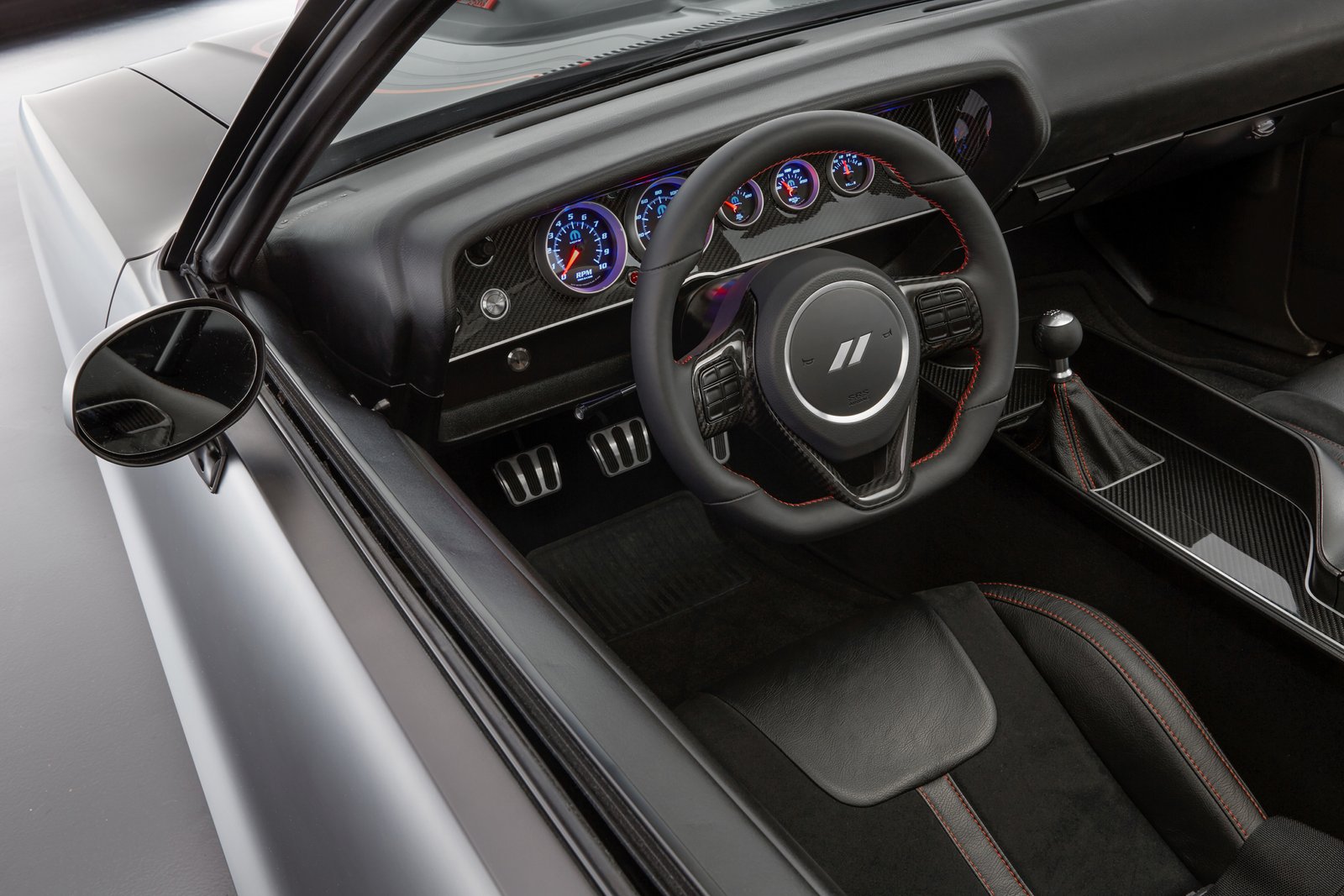 Giving you all the vital stats you need to know, the instrument panel gauges are black, contrasted with gloss carbon fiber instrument panel cluster trim. Since the car was built to be a track-ready beast, the interior features a custom roll bar. The rear seat has been deleted and replaced with netting and a console shelf for storing racing essentials.