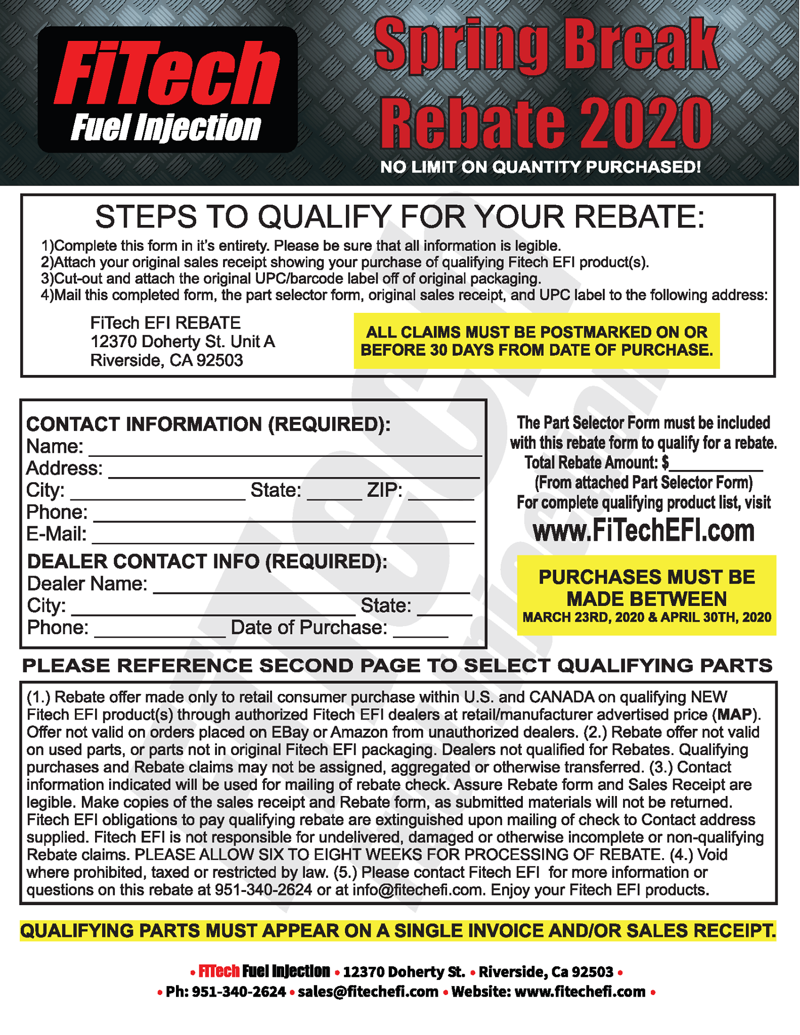 From now through April 30, 2020, save up to $175 off of a fuel injection setup with a fuel delivery system. No less than forty part numbers are eligible for some kind of savings and one of them is sure to fill your EFI needs. All you need to do is purchase the qualifying kits, complete the rebate forms from their Facebook page, and mail them in with your proof-of-purchase documentation. For more information on the rules and regulations, email FiTech at sales@fitechefi.com or give them a call at (951) 340-2624.