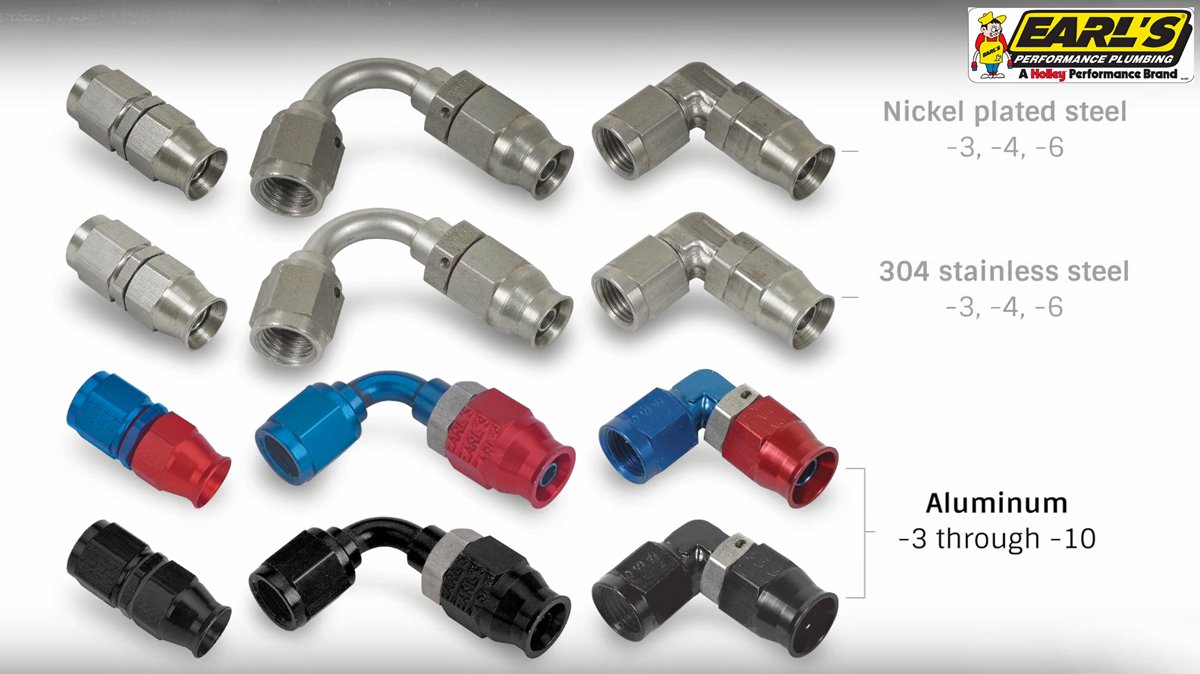 The Earl’s Speed-Seal™ hose ends function with the 0.040-inch liner thickness of the Speed-Flex™ hose. The construction of the hose ends consists of aluminum, stainless steel, or steel, and all the hose ends require the properly sized brass olive hose-end insert. The finish of each Speed-Seal™ hose end can be ordered in anodized black, anodized blue, anodized red/blue, natural or nickel-plating. The hose ends come in a multitude of angles, and many of the fittings provide infinite adjustments (indexed) to connect two points without the hose becoming twisted.