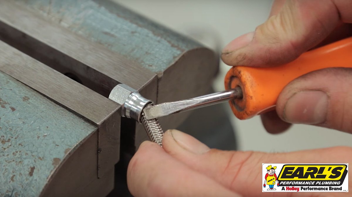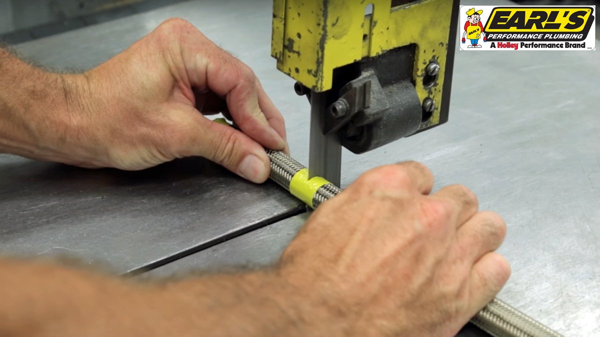 Trimming the PVC coating back about the length of the hose end (one to two inches) provides enough clearance to install the hose end. To complete the hose assembly requires a vice, an Earl’s reaming tool (cleans and smooths the fluid transition area across the olive insert), Earl’s assembly oil, and an appropriately sized wrench. Earl’s recommends the use of a pressure check kit to clean out and pressure test each new hose.