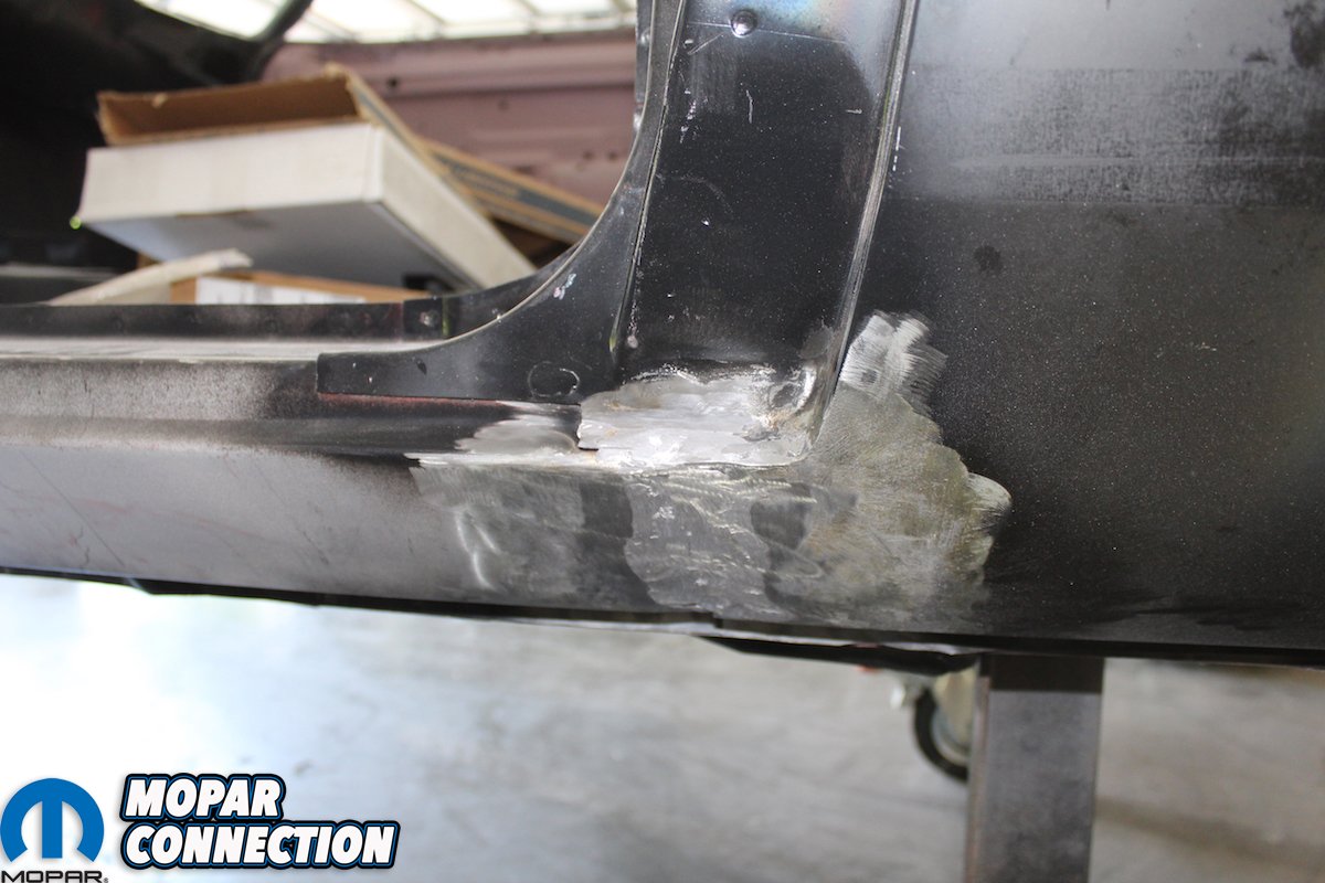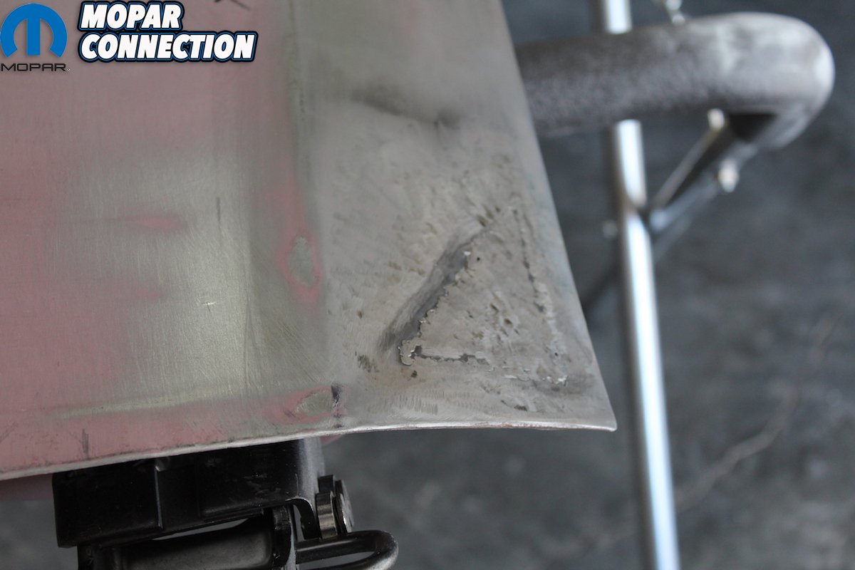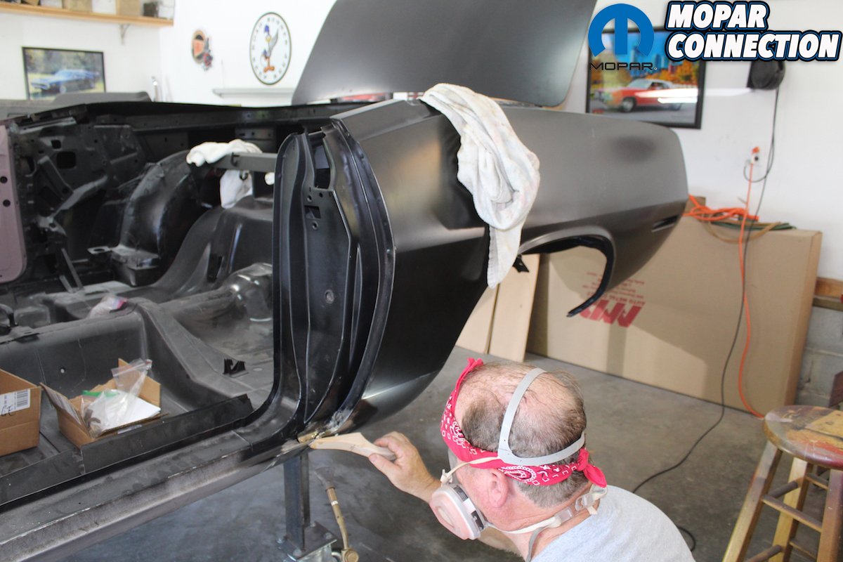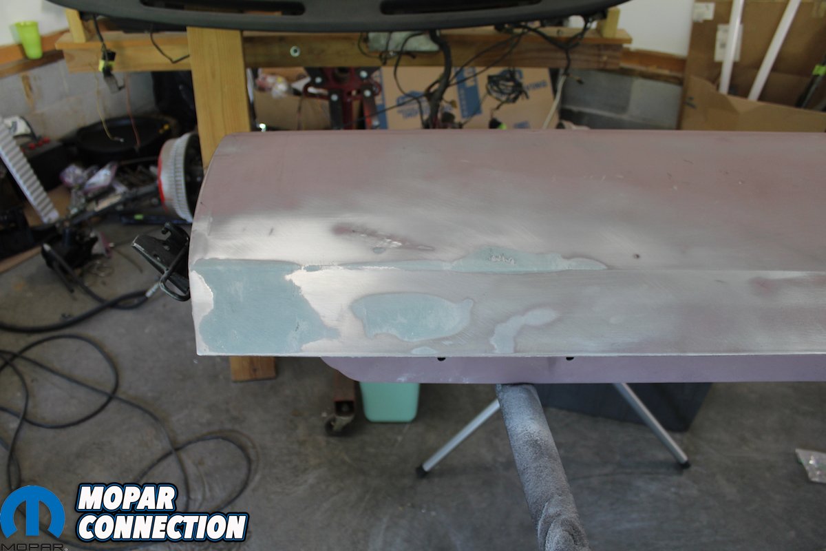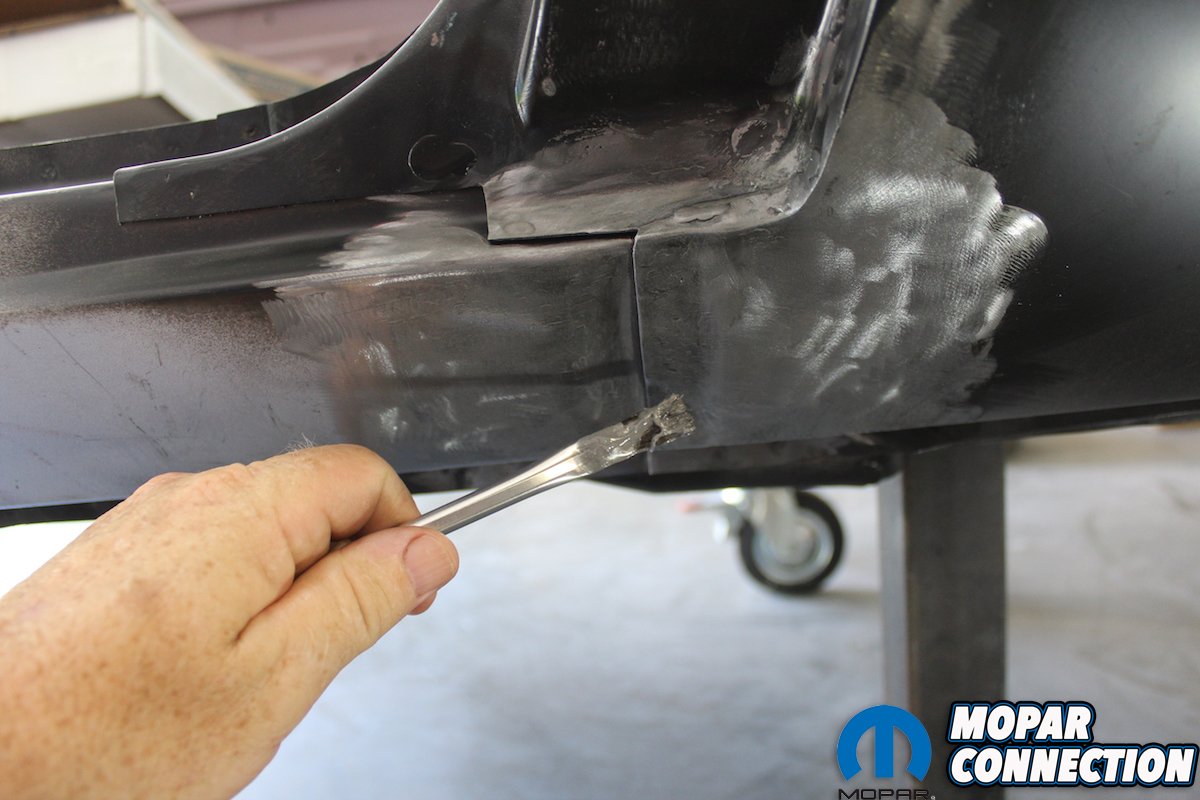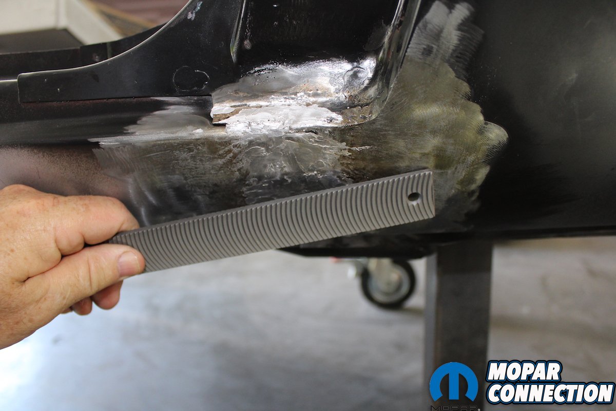 The lead will still be very rough so you use an English body file to shape the lead. File in one direction since that is the way the file is designed to work. After filing we used some fiberglass re-enforced filler to seal and smooth the seam. After sanding the filler you can then skim finish with plastic filler and primer. In all it will take some practice to be able to use the lead to fill the seam the same way the factory did! But it is well worth the time and not that expensive with the help of the good guys at Eastwood! Next step for the “Comeback ‘Cuda” is getting all the bodylines to match on the doors, fenders, hood, truck lid and valences.