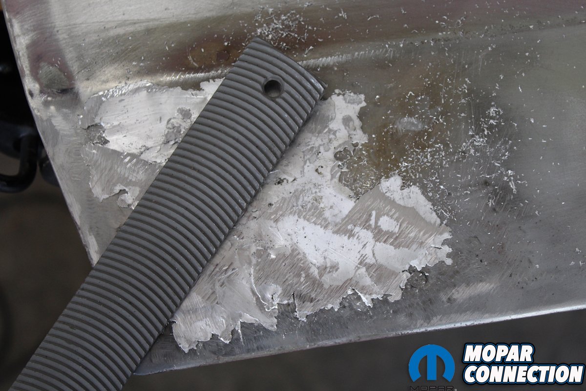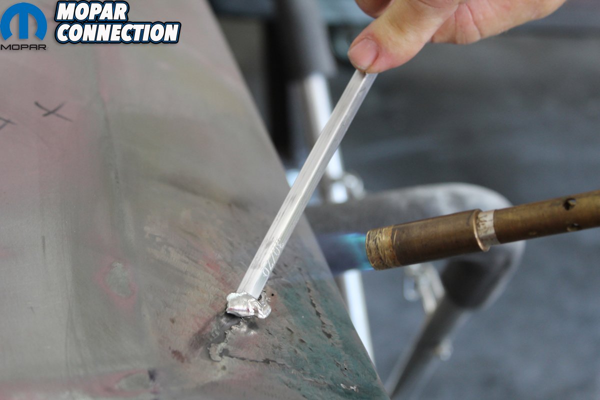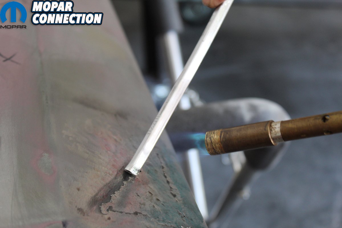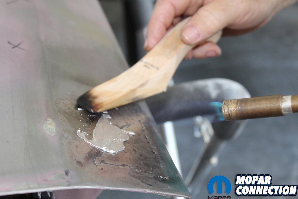 To begin the process rough up and clean the seam of all primer with an angle grinder and at least 40-grit discs. This will give the lead something to bite into and guarantee good adhesion. Then you have to “tin the metal.” This is done by heating the metal and using the acid brushes apply the “tinning butter.” Lightly brush the tinning butter while it is still hot with a copper wool pad. After the area cools wipe the area with lacquer thinner. This is followed by a light bath of baking soda and water to neutralize the acid. This is important to ensure the acid doesn’t continue to eat away at the metal under the lead.