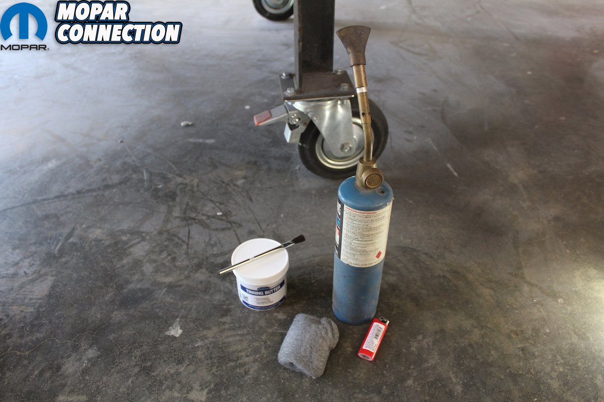 Above left: The heat source can be an acetylene torch or even a propane torch. The “tinning butter” is acid based. You need a steel wool or copper wool pad and the application brush comes with the kit. Above right: Using the torch, you heat the metal area where the lead will be applied. With the brush, you apply the “tinning butter” to the hot metal. Then with the steel wool pad you lightly brush the “tinning butter” ensuring an even coverage.