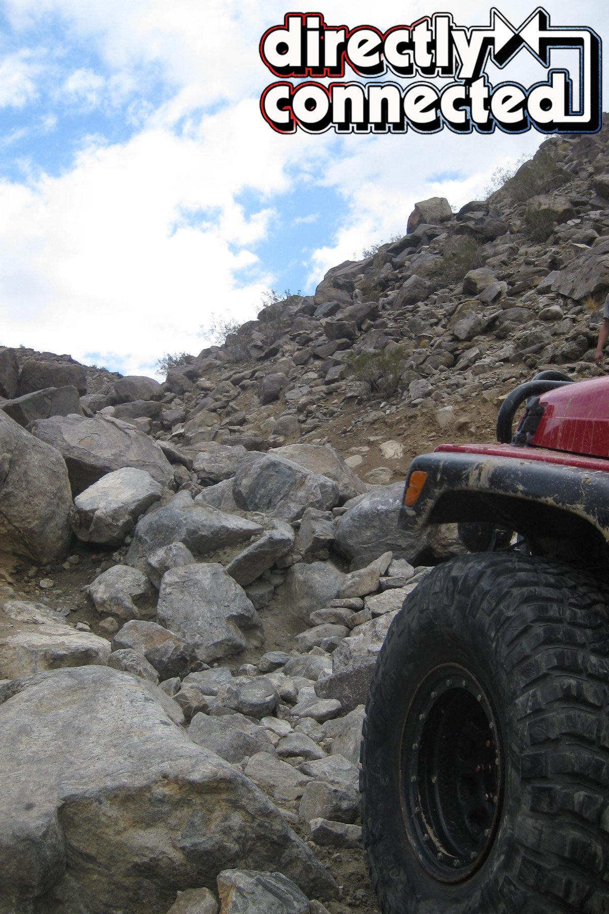 A good idea for anybody running a trail for the first time is to get out and hike sections of the trail to decide how to get through in the safest manner. As we hiked up a particularly nasty section of waterfalls formed by boulders the size of CJ-2a Jeeps, smaller rocks, and loose dirt, we walked next to the Jackhammer trail plaque. A number of the Hammer trails have plaques cemented into the trail just after the most difficult obstacles. Victor Valley Four Wheelers are responsible for establishing the first Hammer trails and trail plaques. These obstacles as such are just called “The Plaque Obstacles.”