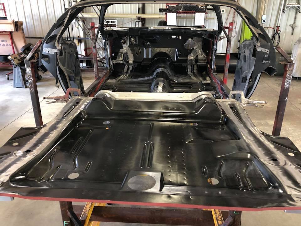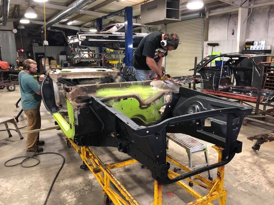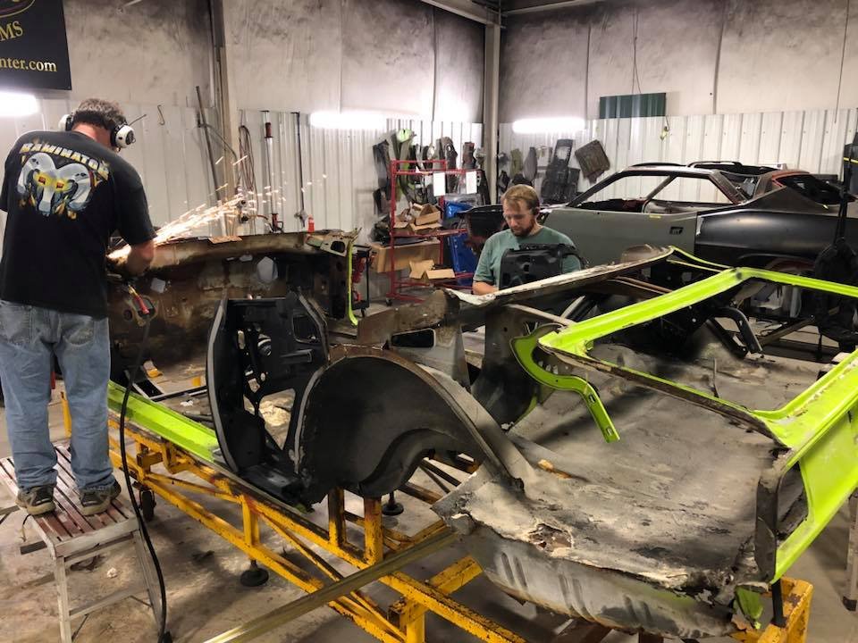 Check out the latest pictures of a ’70 ‘Cuda project on their Facebook page. That’s right, one picture shows nothing left except the roof frame, torsion bar support, front frame rails, and radiator support. Everything else was hacked with nary a concern. Precision frame jigs allow them to cut away every single piece of rotted steel and replace it with brand new iron.