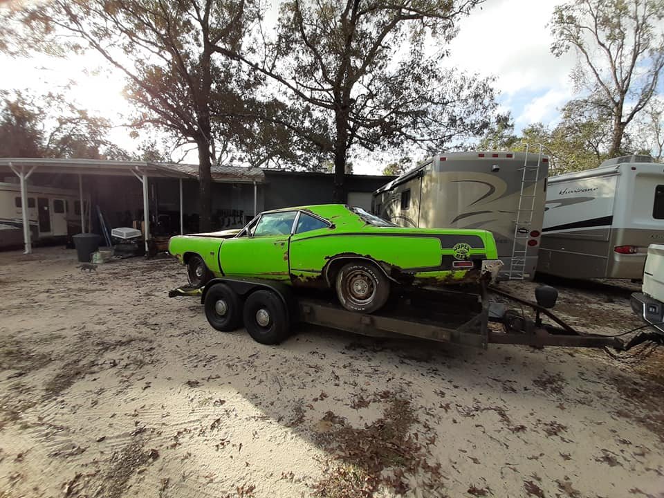 We can’t believe the amount of rust this poor Super Bee has! Every piece of metal has rust of some form. The quarters are so bad, there are chunks of rust falling off on the deck of the trailer and the trunk mat is even coming out the side of the quarter panel! By the looks of the bend at the door and fender gap, the frame rails are probably non-existent!