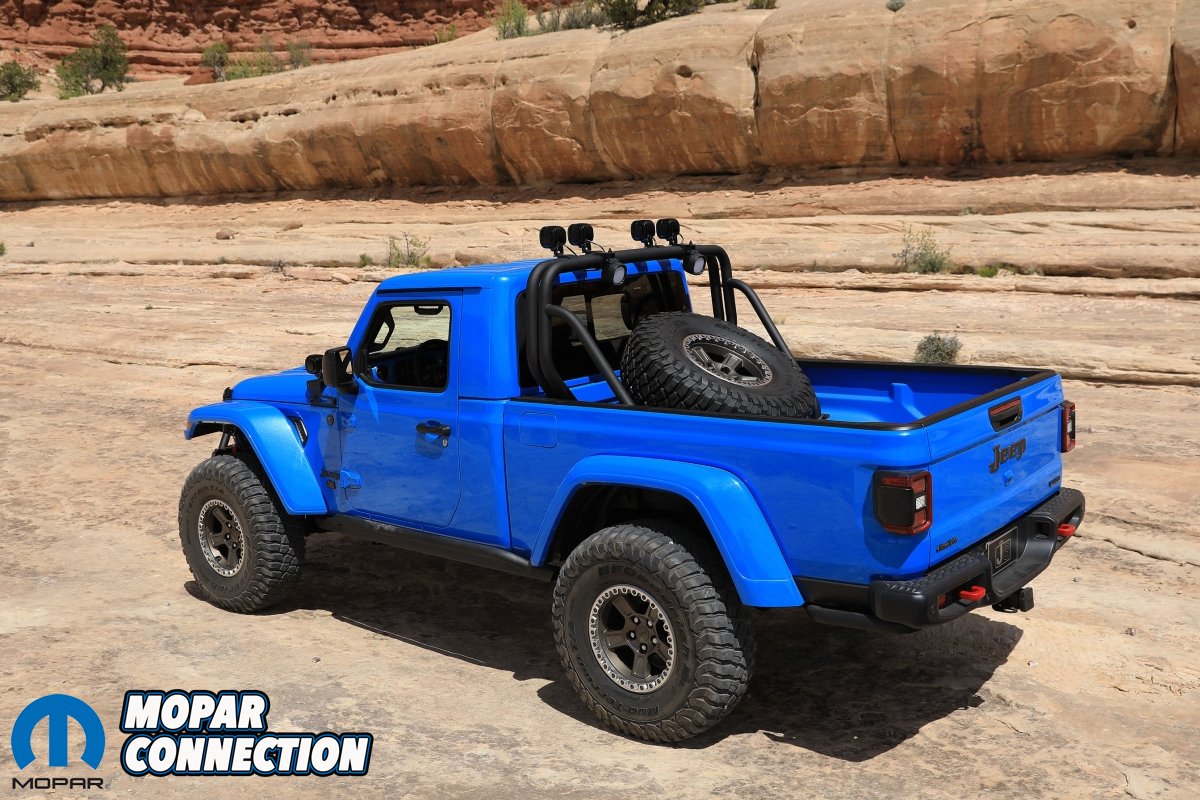 J6: Sporting the configuration of the venerable Jeep Honcho pickup, the J6 is a Rubicon that ditches the rear doors in favor of a conventional truck bed that’s a foot longer than the one found in production Gladiators while matching the 118.4-inch wheelbase of the current Wrangler. The design team looked to Jeep’s heritage for the custom Metallic Brilliant Blue paint while the Brass Monkey finish of the 17-inch beadlock wheels add a contemporary vibe to the mix. A Jeep Performance Parts two-inch lift kit and 37-inch tires enhance the J6’s ground clearance as well as its curb appeal.