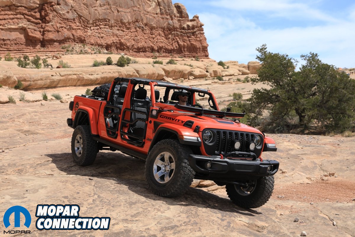 Gravity: Like the Scrambler, the Gravity is a Gladiator-based concept that showcases what’s possible with a little creativity and a copy of the Jeep Performance Parts catalog. Mounted Mopar cross rails in the bed allow a cargo carrier basket to be attached, providing storage space for rock-climbing gear, and a secondary storage system with dual sliding drawers offers additional lockable cargo space underneath. A two-inch lift and 35-inch tires raise the Gravity’s profile, while a cold-air intake and cat-back exhaust system provide the 3.5-liter V6 with some extra grunt.