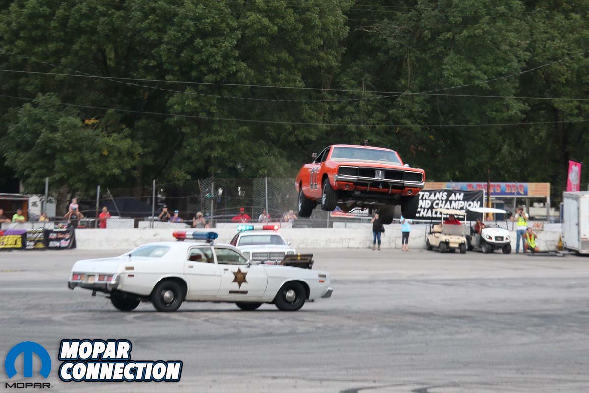 The General’s grand finale, however, was an airborne launch of epic proportions. Down the front stretch came a deputy trailing the orange blur. Building speed around turn one, the General grabbed another gear before reaching takeoff velocity and heading towards the ramp at center stage.