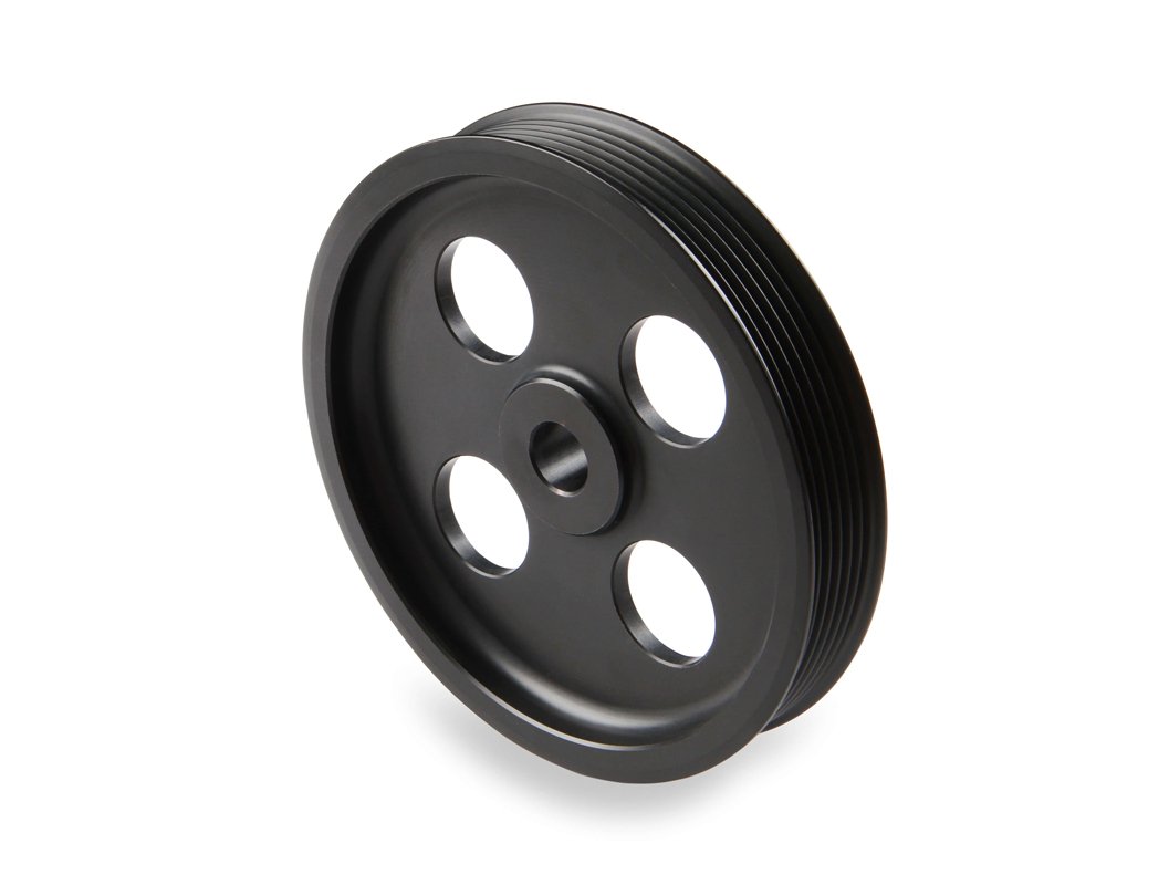The Holley power steering pump assembly has a contemporary style plastic reservoir. A black anodized billet aluminum mounting bracket secures the pump to three existing tapped holes on the left-side cylinder head. A few Hemi vehicles come with electronic power steering (EPS) and do not have the cylinder head tapped for the bracket, so check the head before attempting the pump installation. Holley sized the six-rib billet aluminum black anodized pump pulley for optimum speed and pressure control. The pulley requires an installer that can be purchased (or rented) from a local parts store.