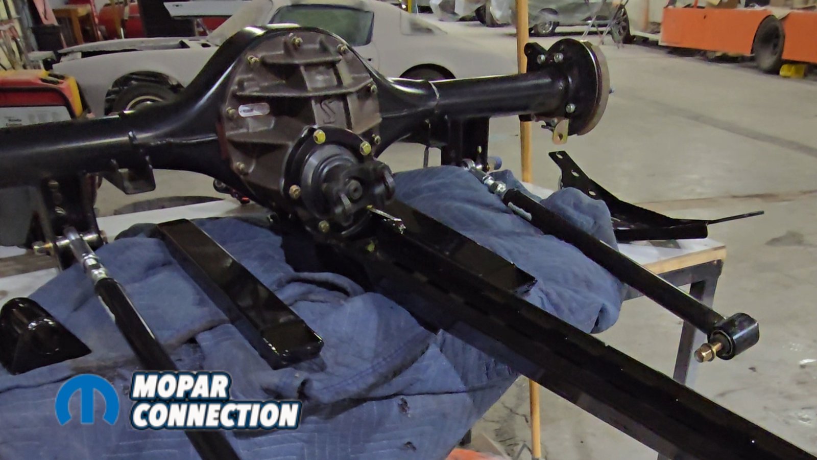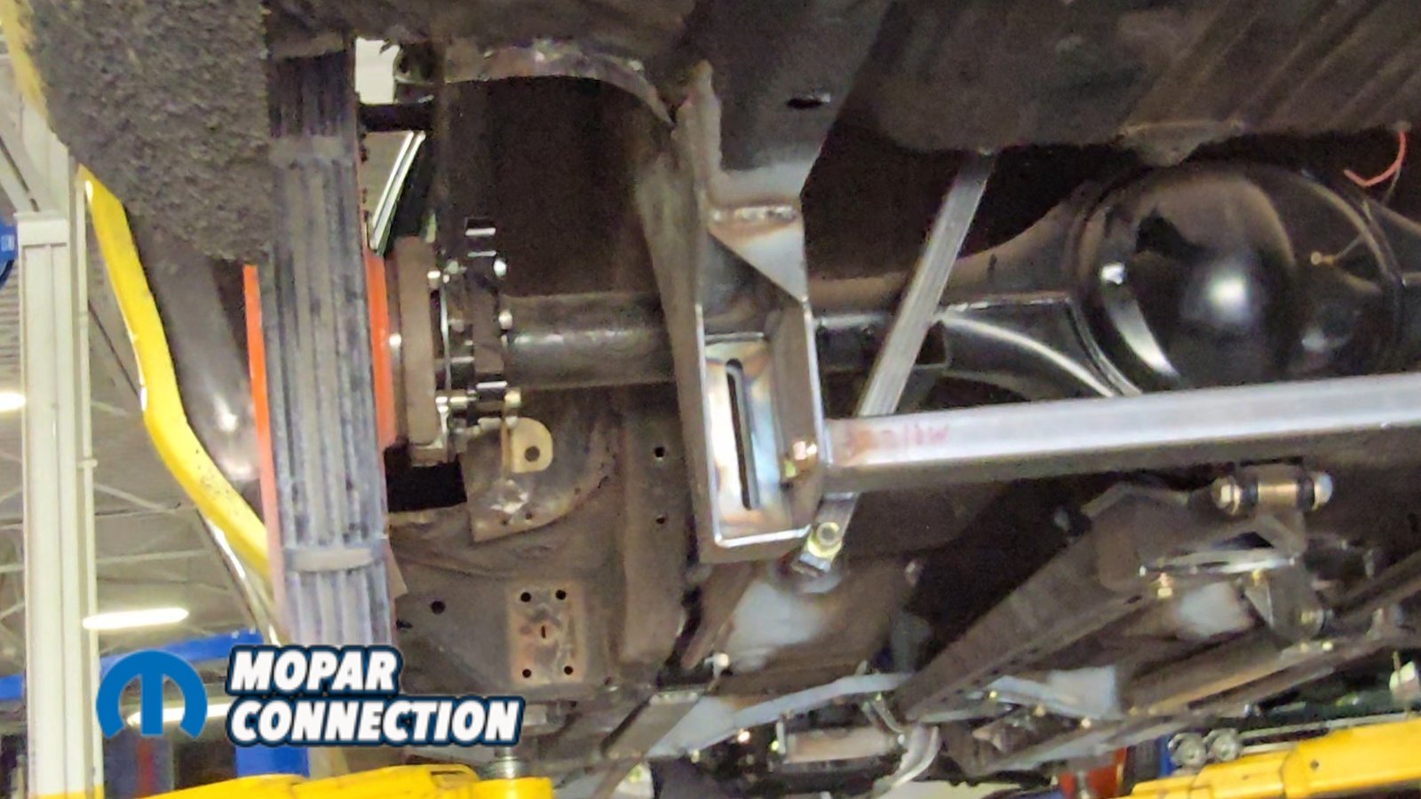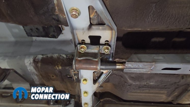With the axle located, we could finally install the torque arm. Two bolts attach the torque arm to the axle assembly, while the front of the arm mounts to a bracket containing a bushing. This bracket slides over the torque arm and bolts directly to the front crossmember.