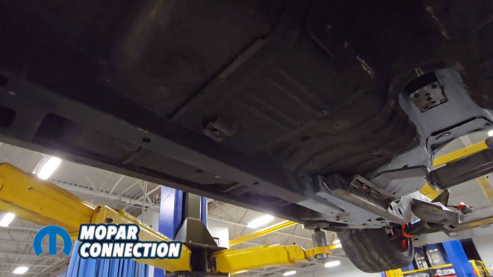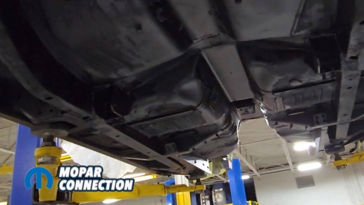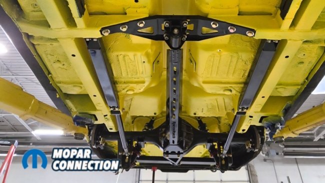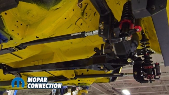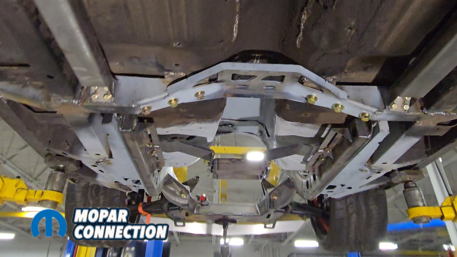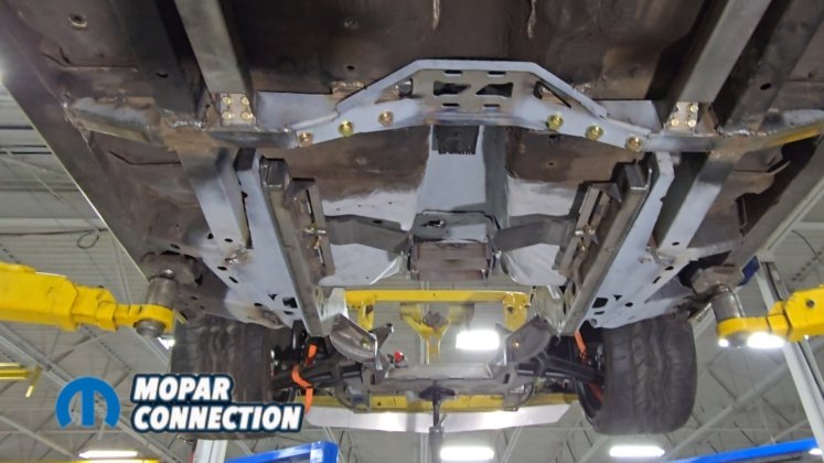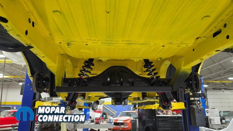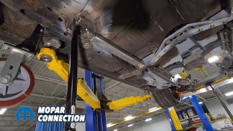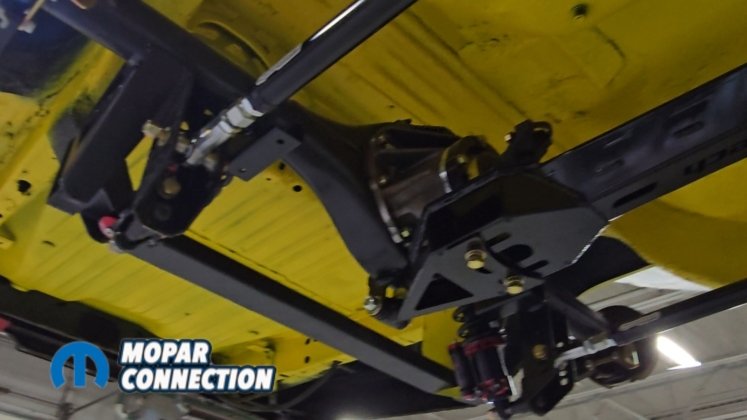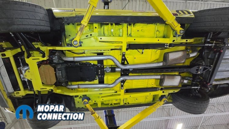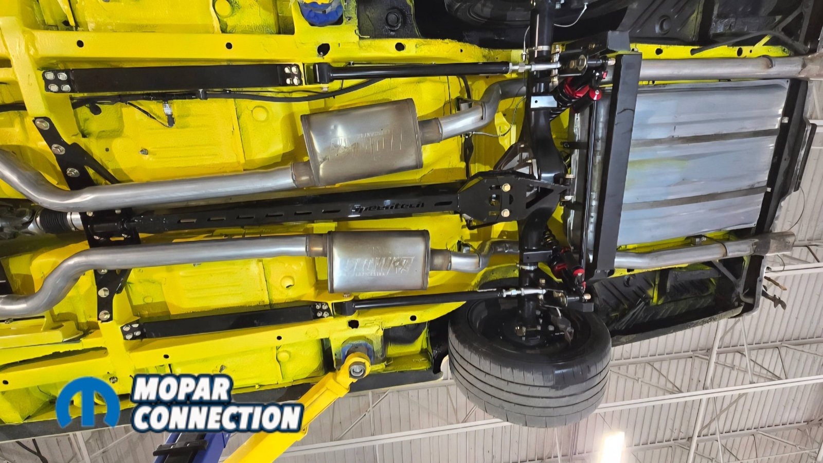 Above: The install is finished with the fuel tank, fuel lines, brake lines, driveshaft, exhaust, and remaining components installed underneath the car.