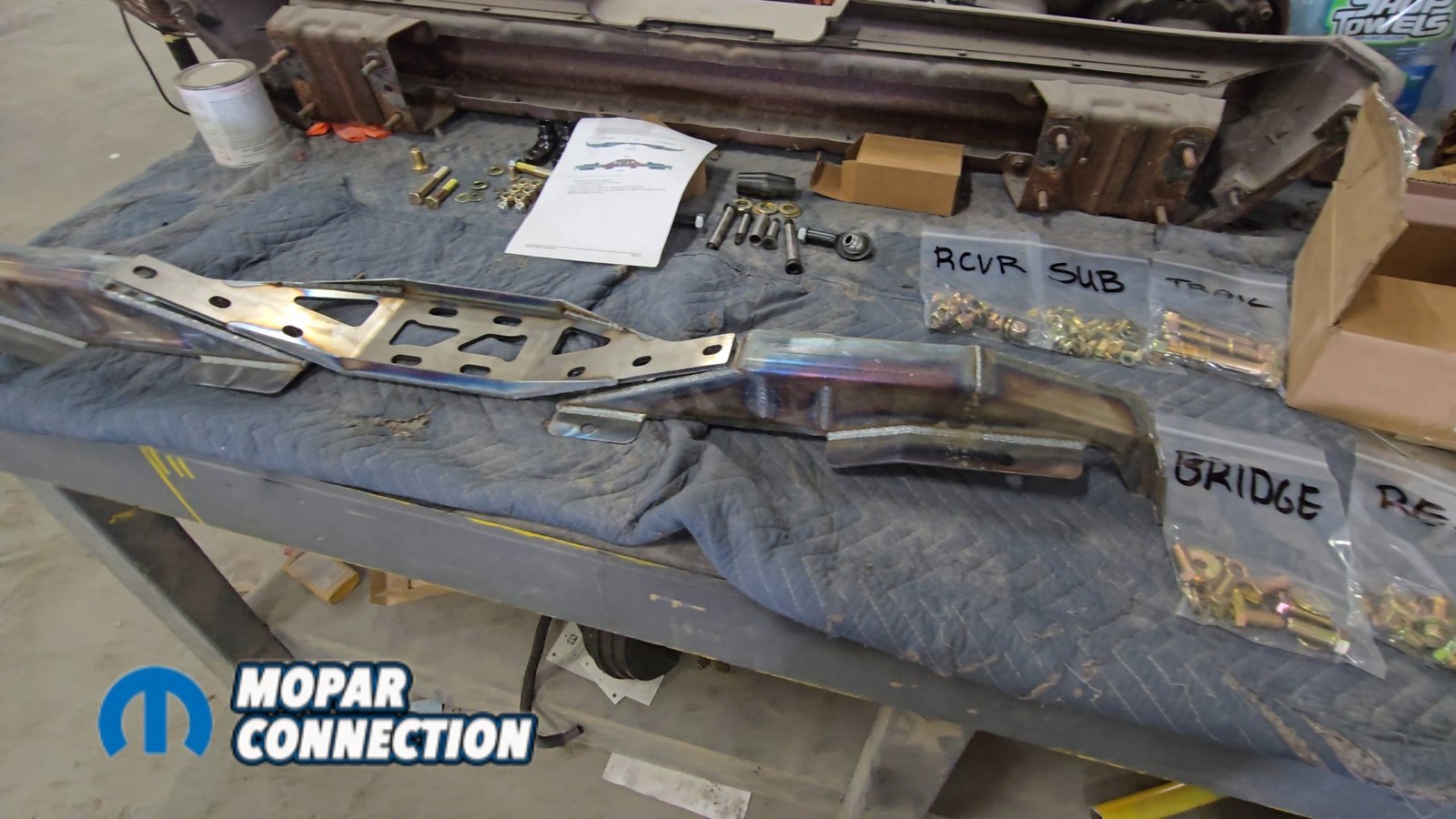 The next step was installing the torque arm front crossmember. This is the structure that the front of the torque arm mounts to, and its position is located just under the driver seat area. The crossmember, also referred to as the bridge, is made up of three components that are specific from left to right.
