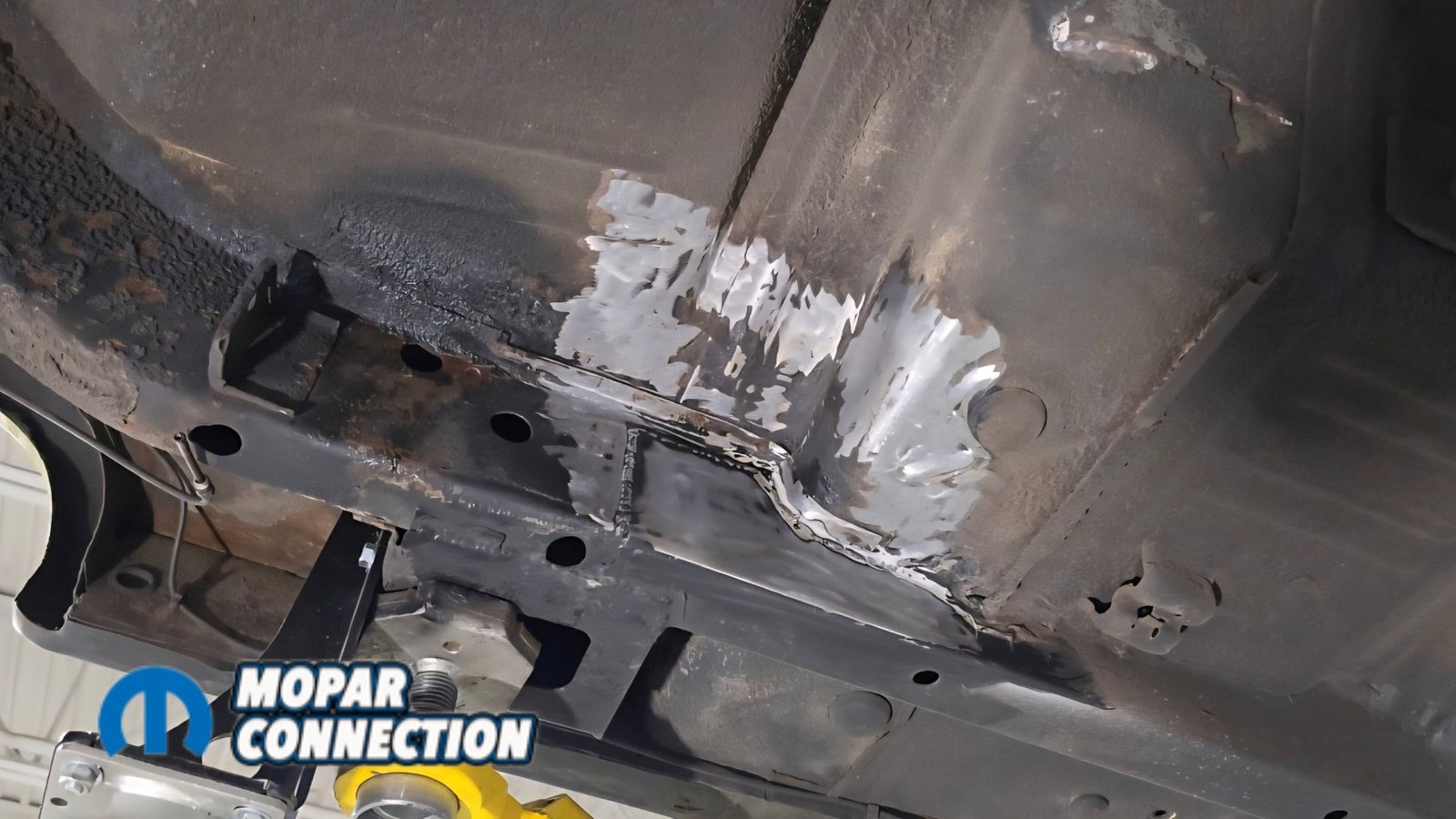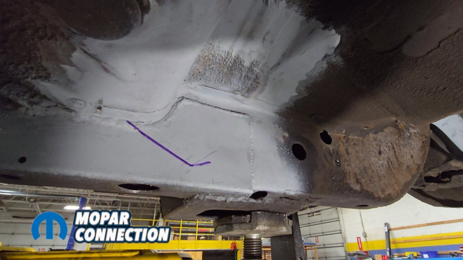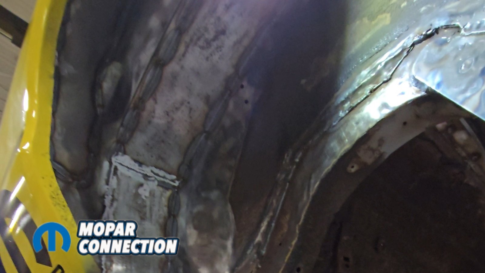 Above: The factory shock mount location has been removed and the area ground to bare metal. We followed up with SEM weld-through primer to protect the metal and ensure proper weld quality during reassembly.