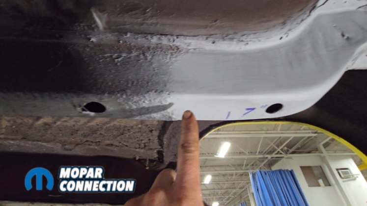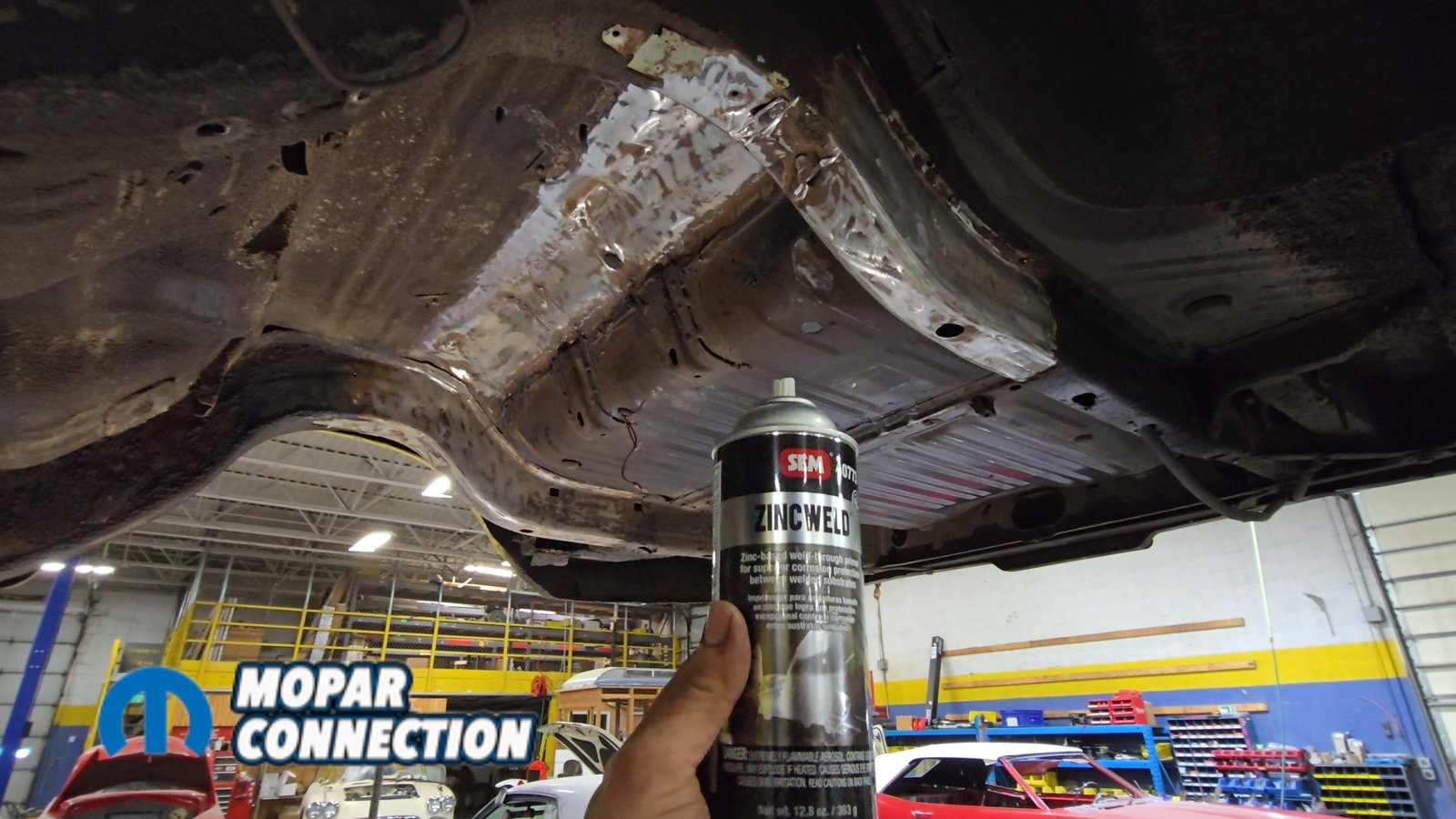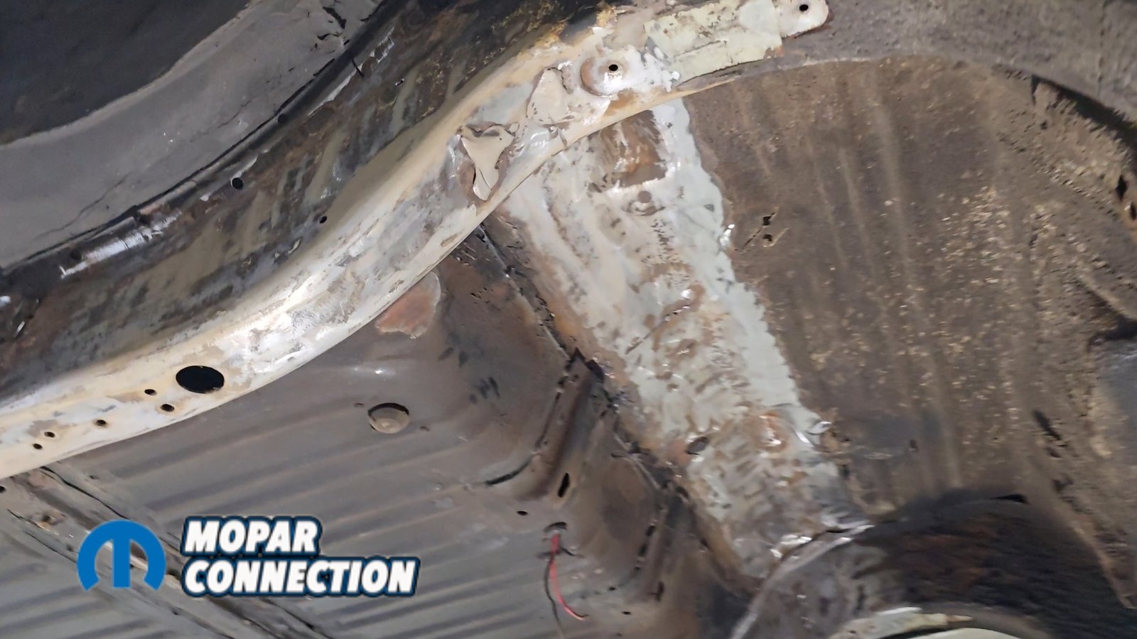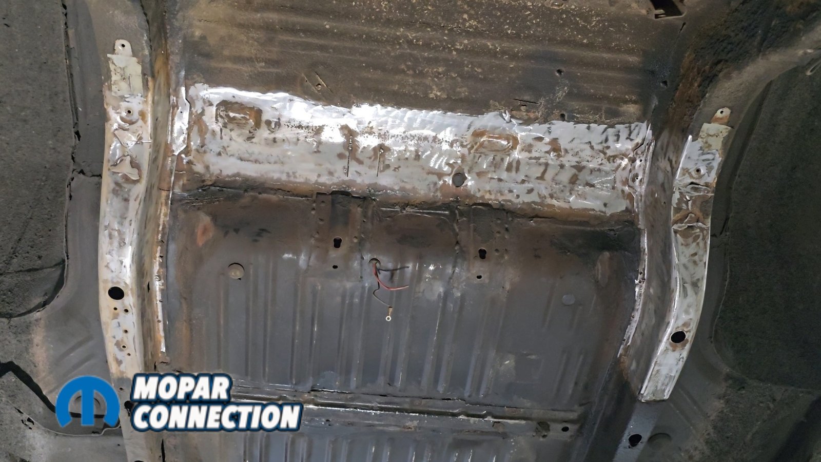 Above: The factory shock mount location has been removed and the area ground to bare metal. We followed up with SEM weld-through primer to protect the metal and ensure proper weld quality during reassembly.