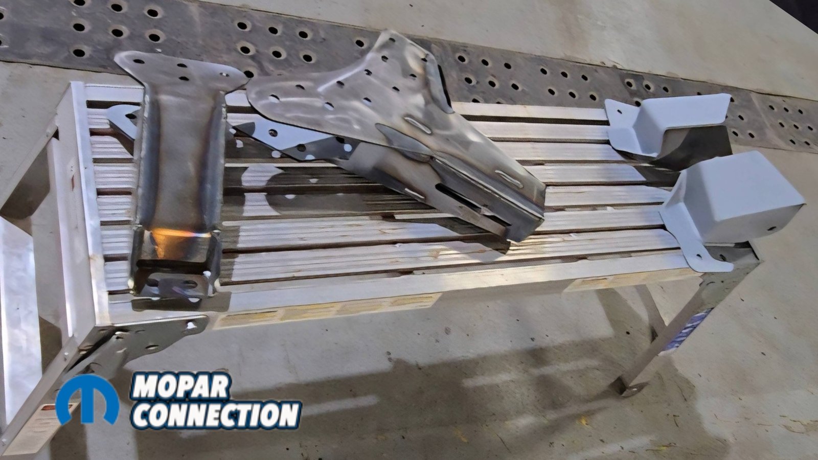 Above Left: The new shock mount bracket is mocked into position to verify fitment before final welding. Above Right: Panhard bar frame brackets shown prior to installation. These will be welded to the frame rails to locate the rear axle laterally.
