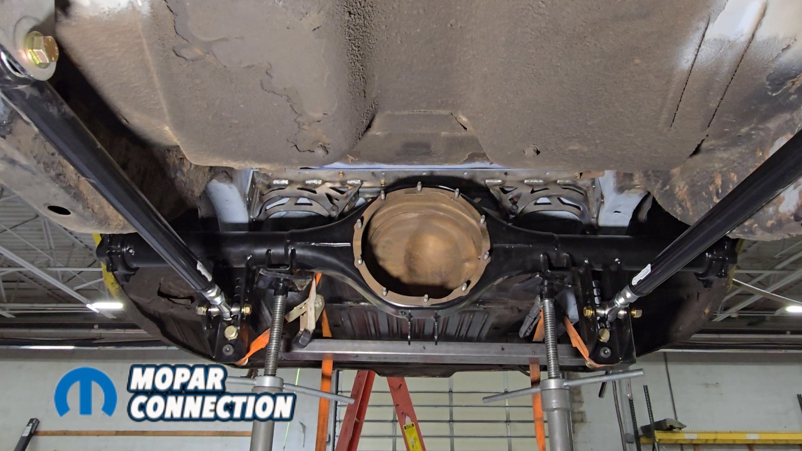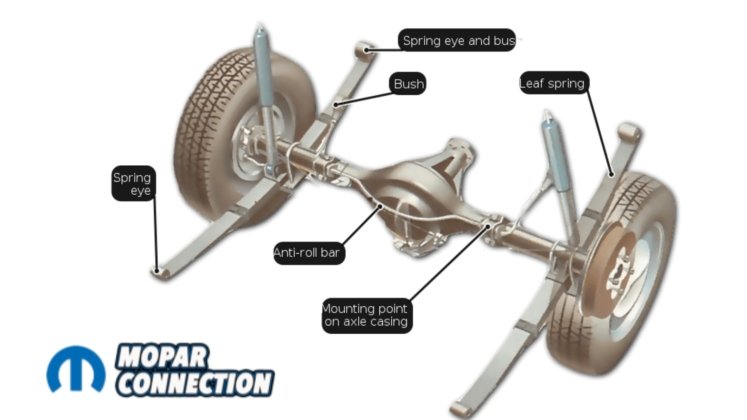 Before getting into the install, it helps to understand what a torque arm does. On a factory leaf-spring car, the leaf springs handle multiple jobs. They locate the axle, control its rotation, and manage suspension travel through four mounting points on the unibody attached by shackles. A torque arm system separates those jobs.