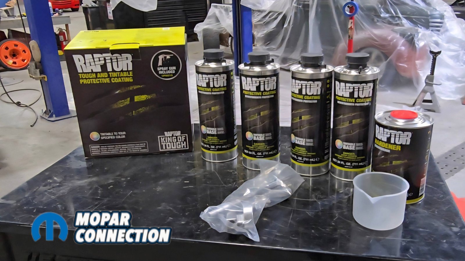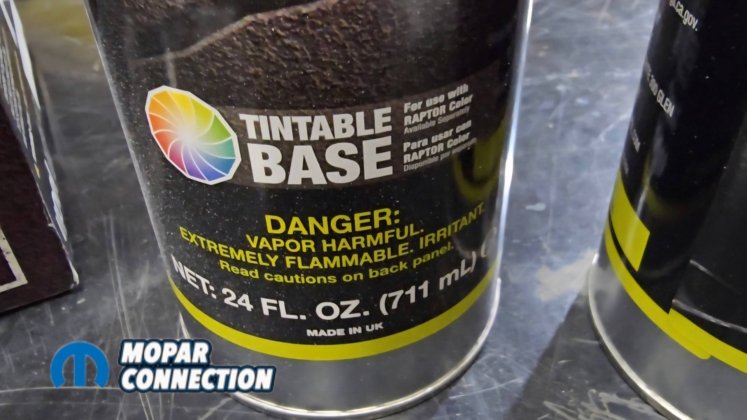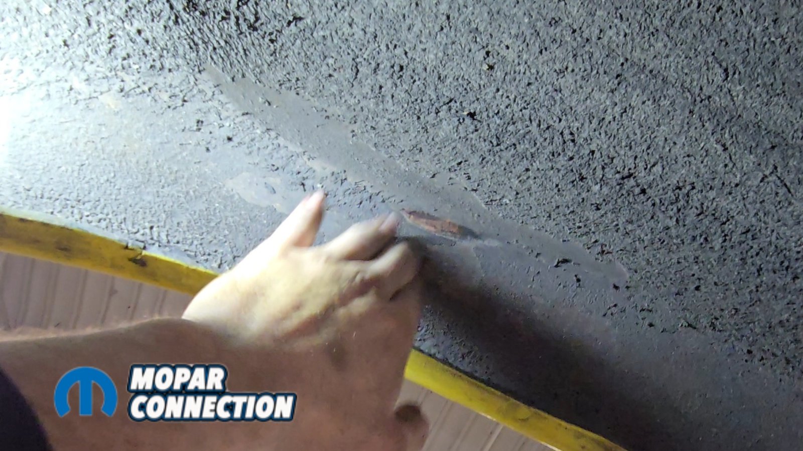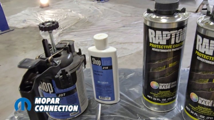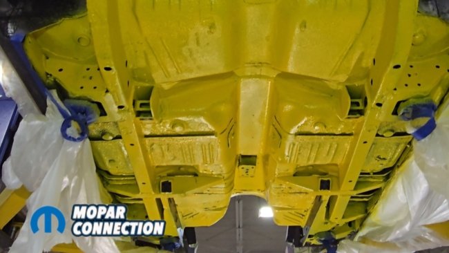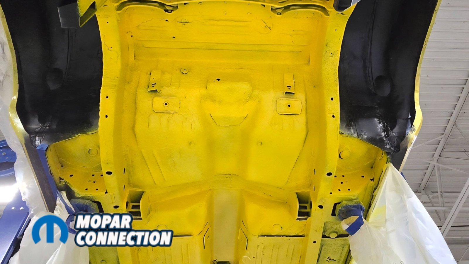 Above: Raptor Liner, a tintable coating similar to a truck bedliner, is applied to the underside of the car. The kit includes hardener and an application gun, and sprays on just like a traditional bedliner. By adding yellow, we were able to match the desired finish.