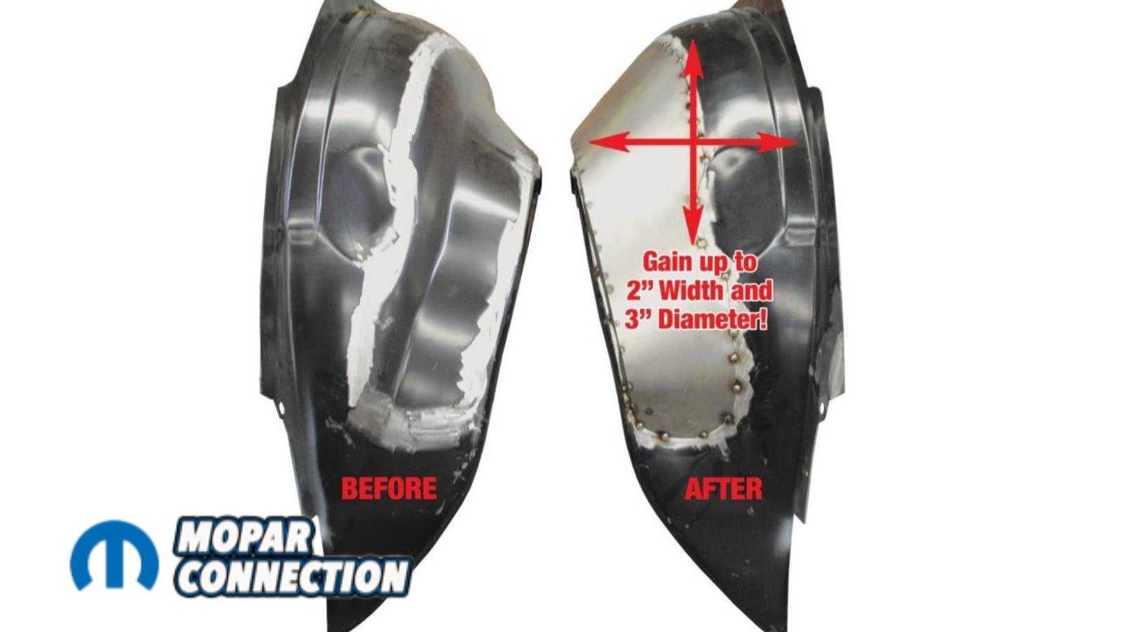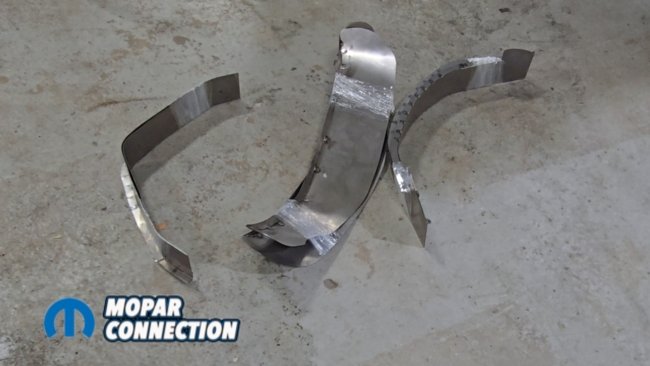 Above Left: US Car Tool outer wheelhouse extensions (USCTAM2049) are installed to gain additional outer tire clearance. On B-body Mopars, the factory wheel tub hump is removed to eliminate interference. Above Middle: The factory wheel tub hump being removed, gaining up to 2 inches of additional inner clearance. Above Right: The extension is installed into the car—take your time, protect the paint, and allow proper cool-down between welds.