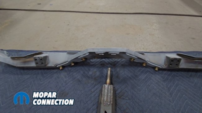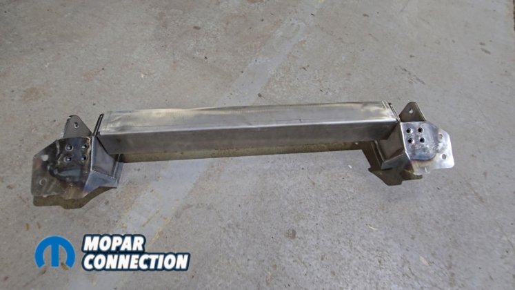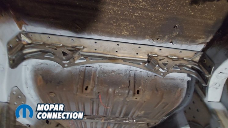 3/8-inch bolts were installed temporarily to hold the crossmember against the floor while the Panhard bar brackets were mocked into place. On the passenger side, the Panhard bar bracket measures 8⅛ inches from the factory frame rail locating hole. On the driver side, it measures 7 inches from the frame rail locating hole.
