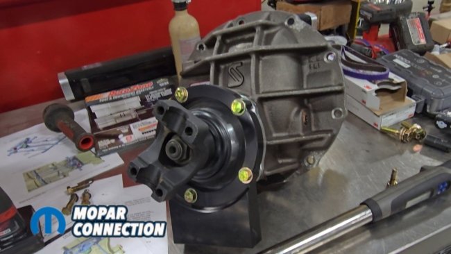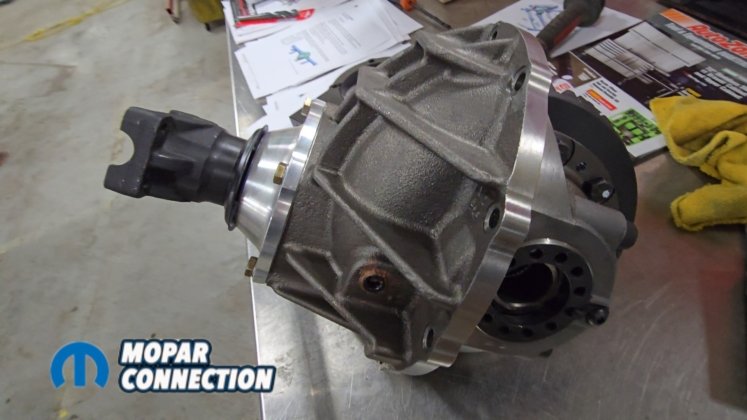 Above Left: The third member is equipped with a Yukon gear set and Eaton Truetrac, similar to the previous 8¾ setup. Above Middle: The axle housing is lifted into place and aligned with all suspension mounting points. Above Right: The third member is installed, axle shafts are slid into place, and the kit includes parking brake provisions.