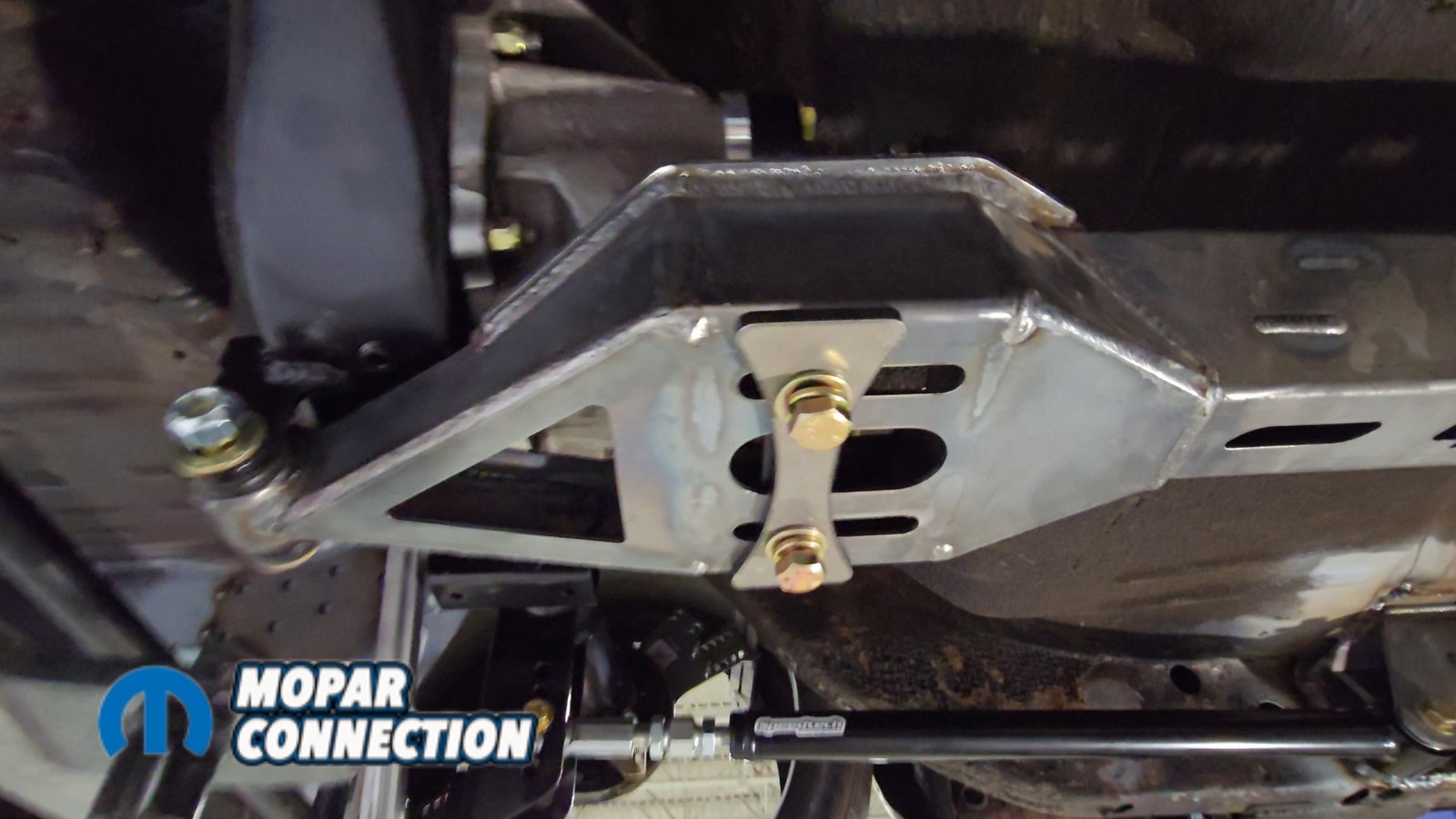 Above Left: The crossmember, or “bridge,” is made up of three components, each specific to its left-to-right position. Above Right: The torque arm mounts to the bridge using a slotted bracket, allowing for adjustment during setup.