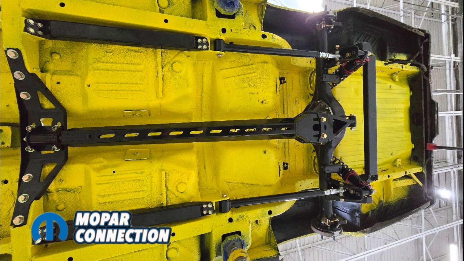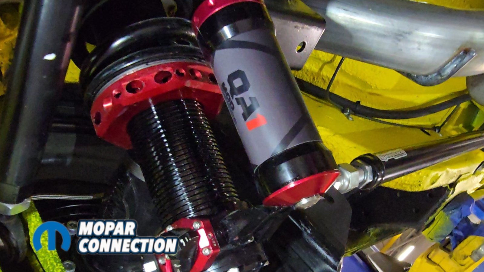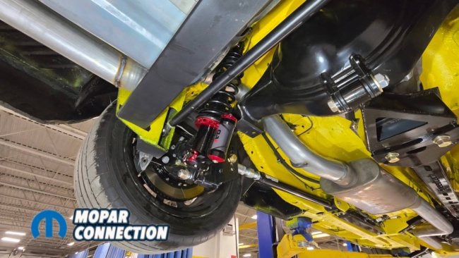 Above Left: The suspension system drops back into place, with the yellow underside making the components stand out. Above Middle & Right: QA1 MOD shocks are installed and set to a middle adjustment, allowing for fine-tuning once the car is back on the ground.