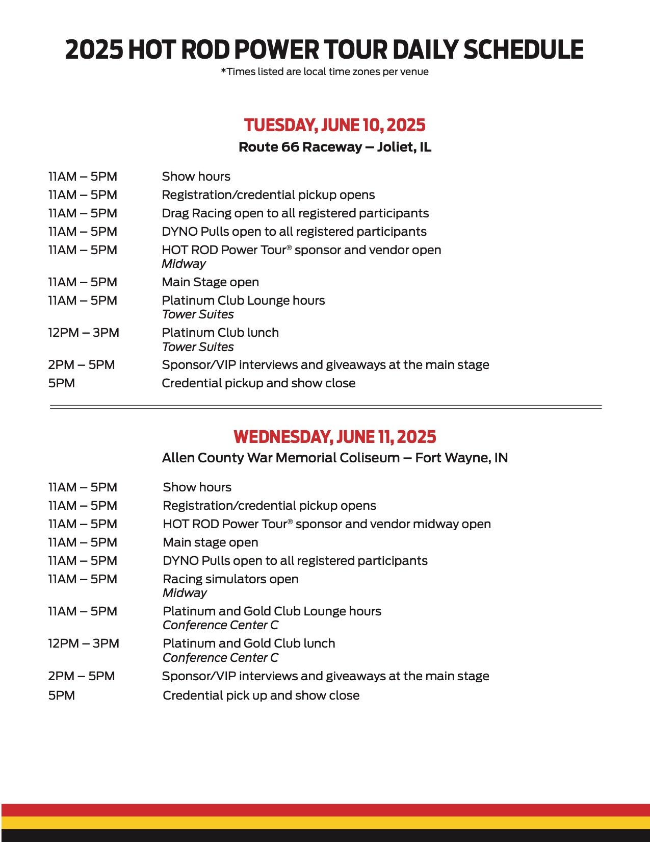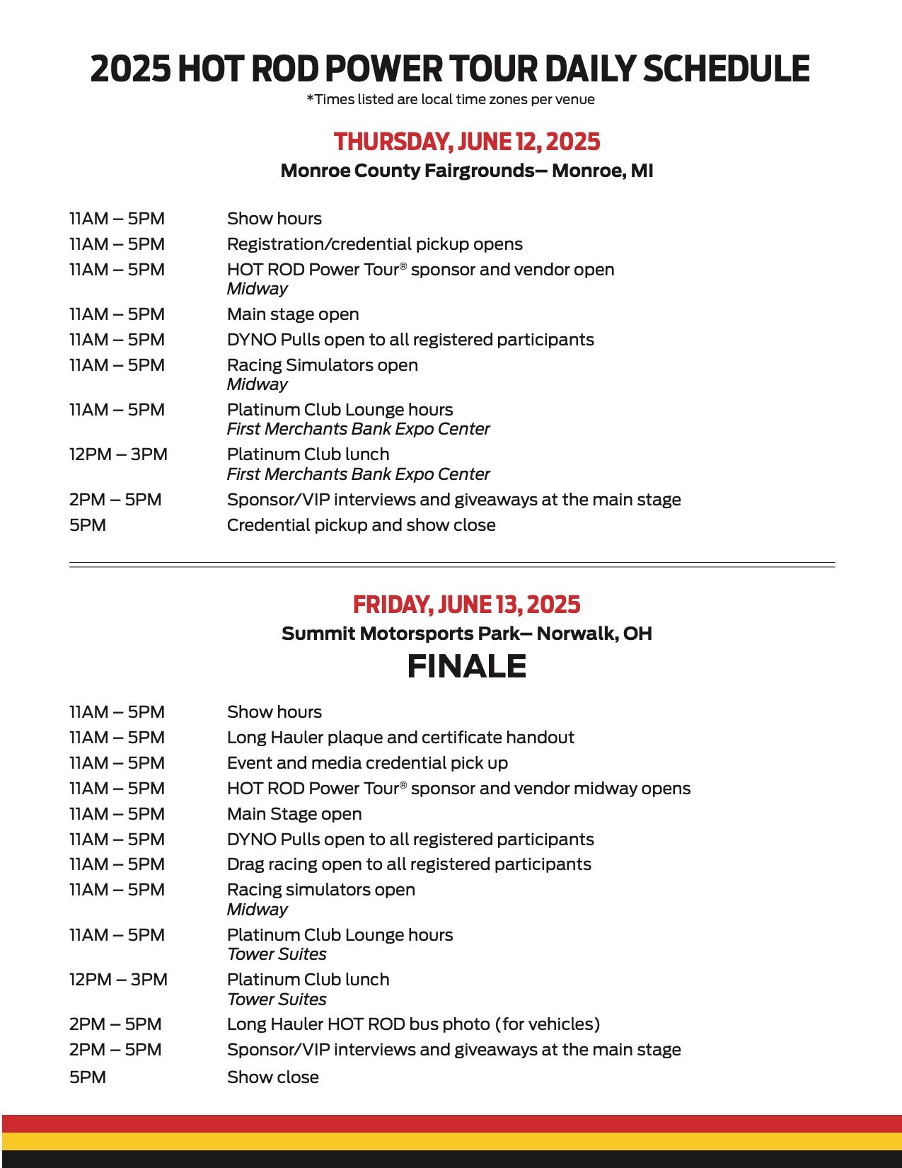 For those of you still on the fence about going or those already signed up as participants, Hot Rod just released the official schedule for the Power Tour 2025, which we’ve included below. But if you’d like to download the PDF for yourself, just click this link HERE.