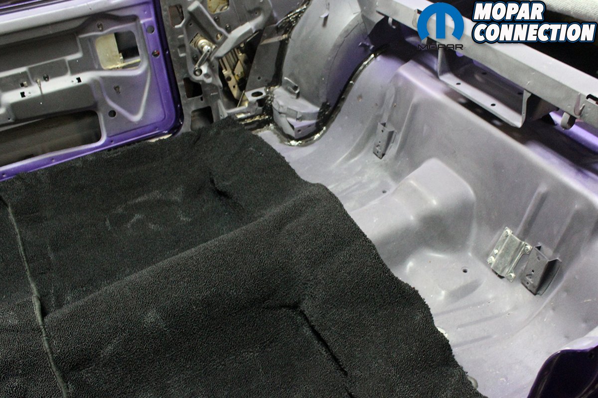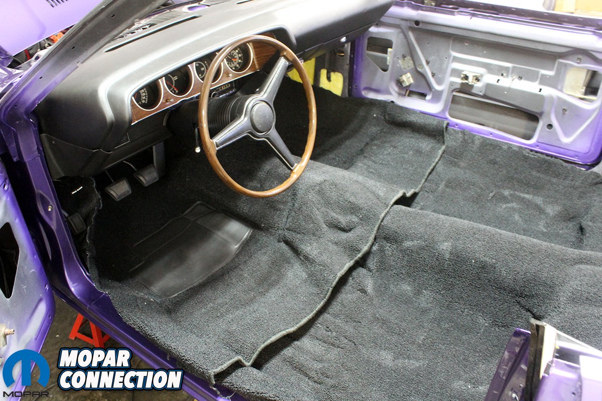 Since the Comeback ‘Cuda is a convertible, we put together the carpet, front doors, ¼ glass, and bucket seats, but we have to wait to install the rear seat and panels until we get all the trim, top frame, pump, and rams so we can get the convertible top installed. We leave the top installation to the pros, so having the car where we can drive it onto the trailer is a must.