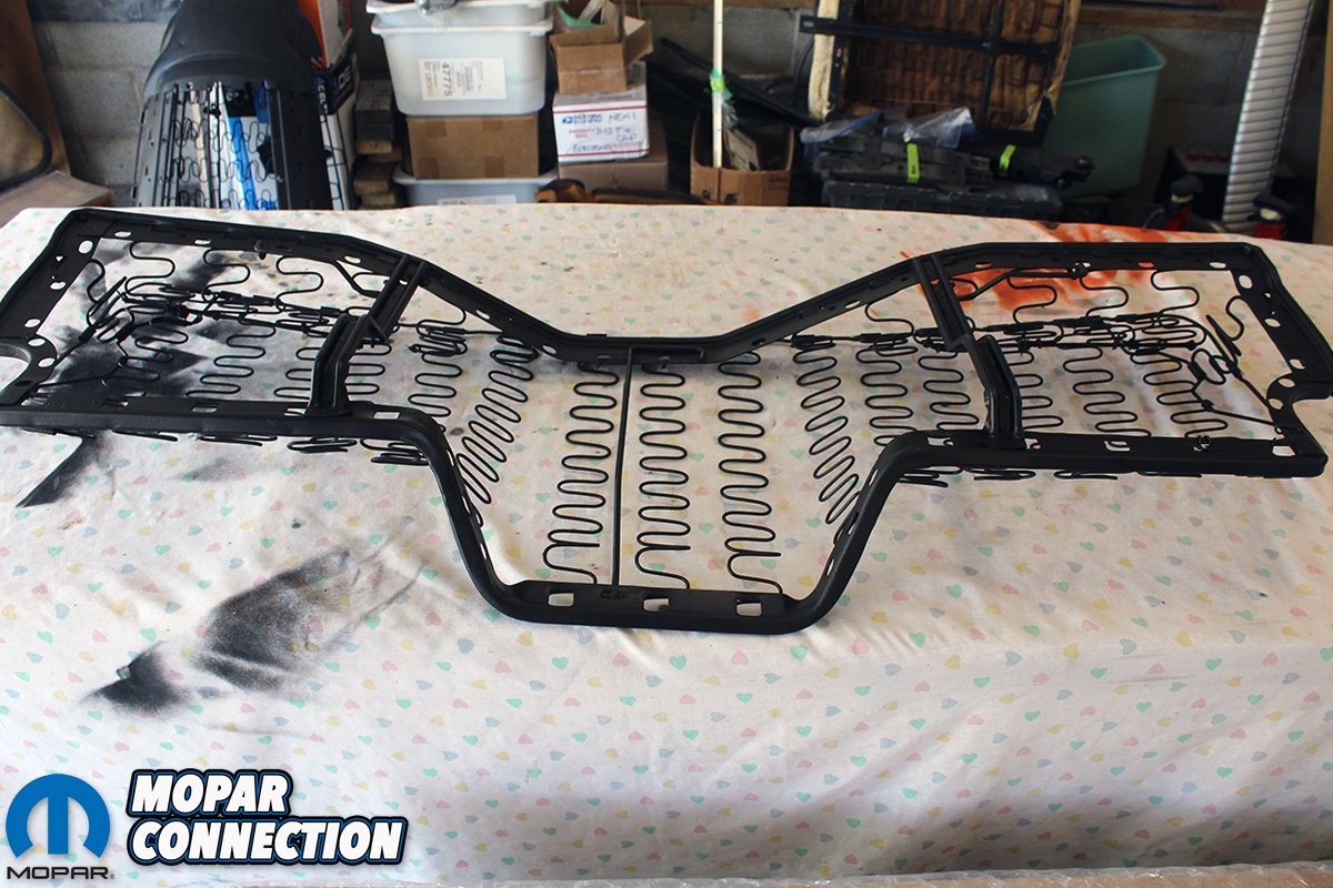 We then started on restoring the bucket seats and rear convertible seat. By the way, the hard top and convertible rear seats are completely different. And even though our original one was slightly bent from the accident, it thankfully was salvageable and did not have any rust on the frame. The seats were broken down to the frame completely. We blasted, repaired, painted, and replaced all the foam and burlap backing, and recovered the seats with new covers from Legendary Auto Interiors.