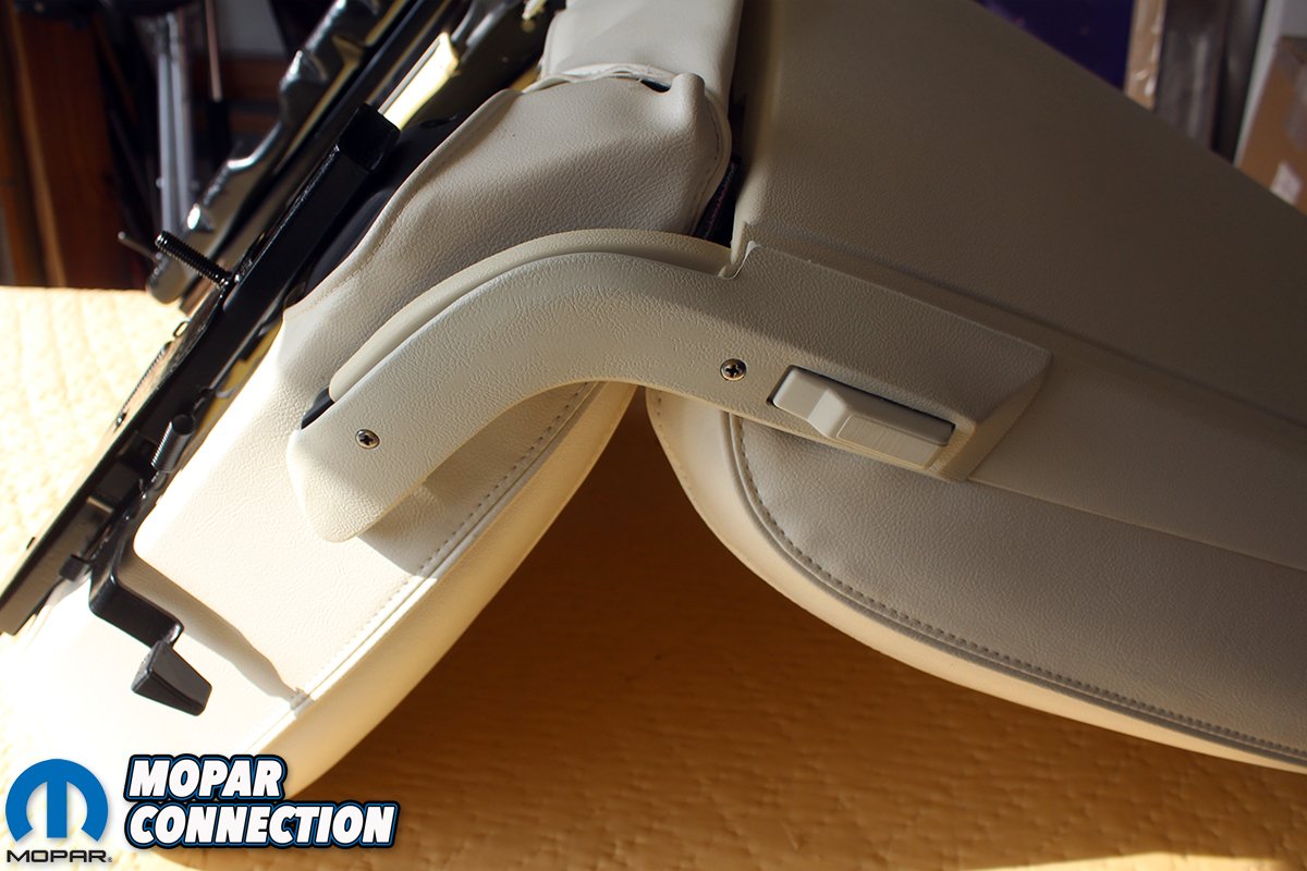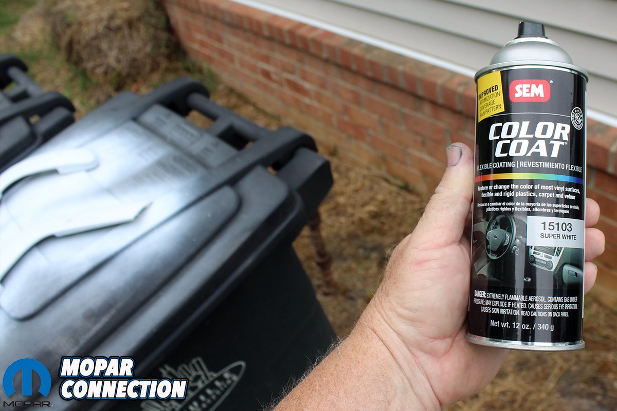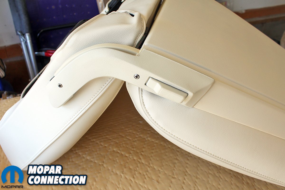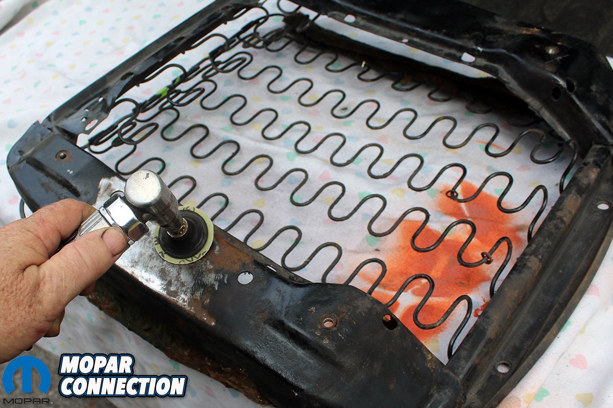 Above left: After discovering we had the incorrect seat backs, hinge covers, and even release buttons we were able to score a set of 1970 seat correct hardware on eBay. After stripping them by hand so we can preserve the original grain on the metal hinge covers we paint them all to match the slightly “off white” interior material. Above right: Since we had already restored a 1970 Road Runner with a white interior, we knew the exact dye needed to match this interior. SEM 15103 Super White. We use this dye on all plastic parts, so they all match the seat material. Be sure and clean the parts with lacquer thinner before shooting them.