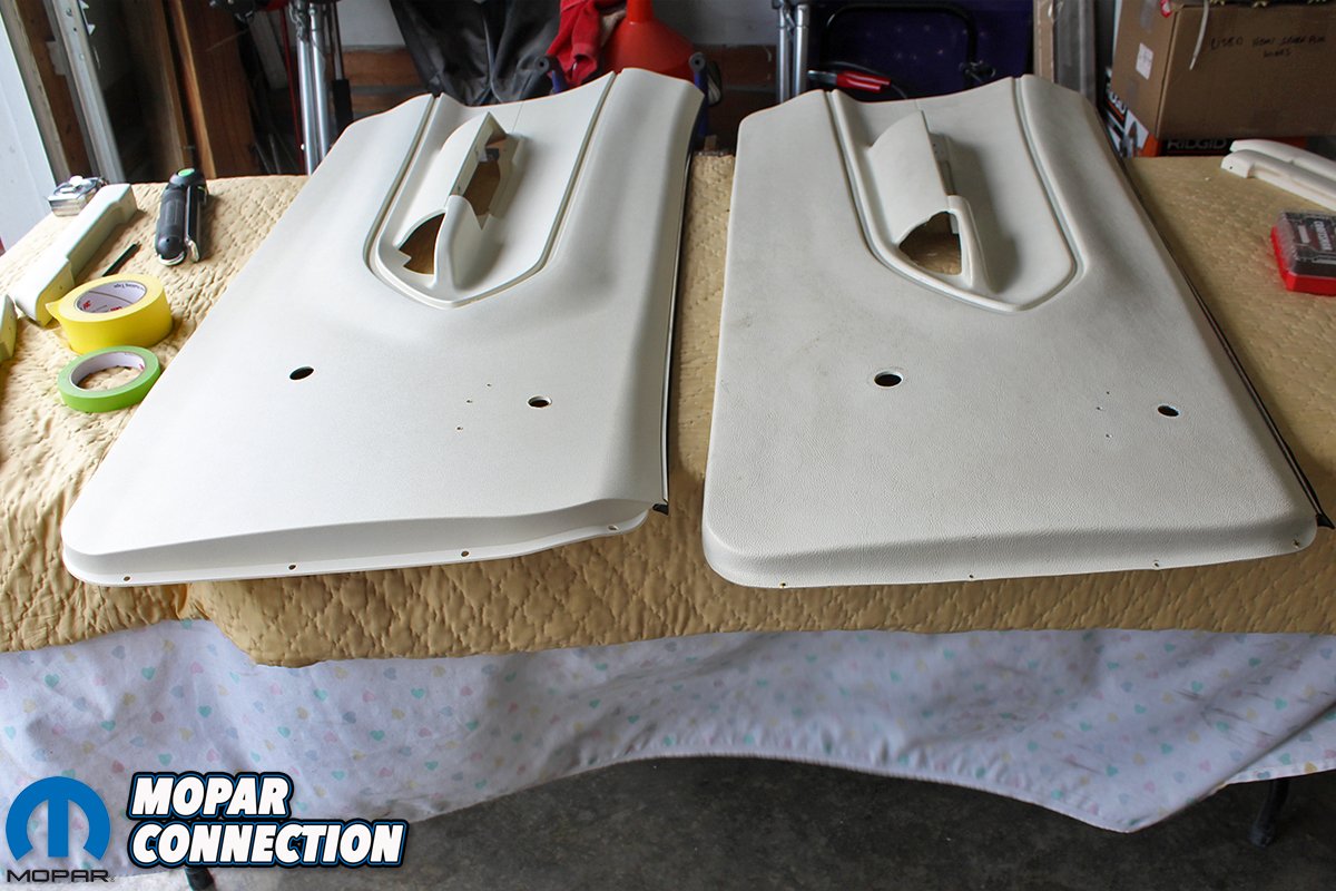 Above left: We then get out the door panels from YearOne. We clean them with lacquer thinner and shoot them with Super White SEM dye. We did have to take the old panels out for verifying the location of the ‘Cuda emblem. We also painted the door arm rests and attach them with the correct screws. The door window sweeps are already attached to the door panels and fit great! Above right: Before you put the door panels on, you definitely need to make and attach a vapor barrier to the door. Just get a sheet of plastic and cut it to fit the door and the openings for the handles. We use caulk to attach the plastic since it will peal back later if needed. This helps to keep moisture out of the interior and it also helps with wind noise on a hardtop. Once the barrier is in place pre-punch the holes for the clips on the panel that attach it to the door. That makes the installation go a lot smoother.