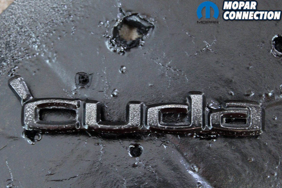 Above left: When we were drilling the holes in the door panel for the ‘Cuda emblem we noticed they needed a little attention to detail. They were not bad enough to replace but the black edge was ragged. We took and cleaned them up with 0000 steel wool and shot them with a light coat of semi-gloss black. After they dry just remove the color off of the face of the emblems with the 0000 steel wool. They will then look like new. Above right: We then attach the door panel and all the new hardware, and the finished door panel looks great!