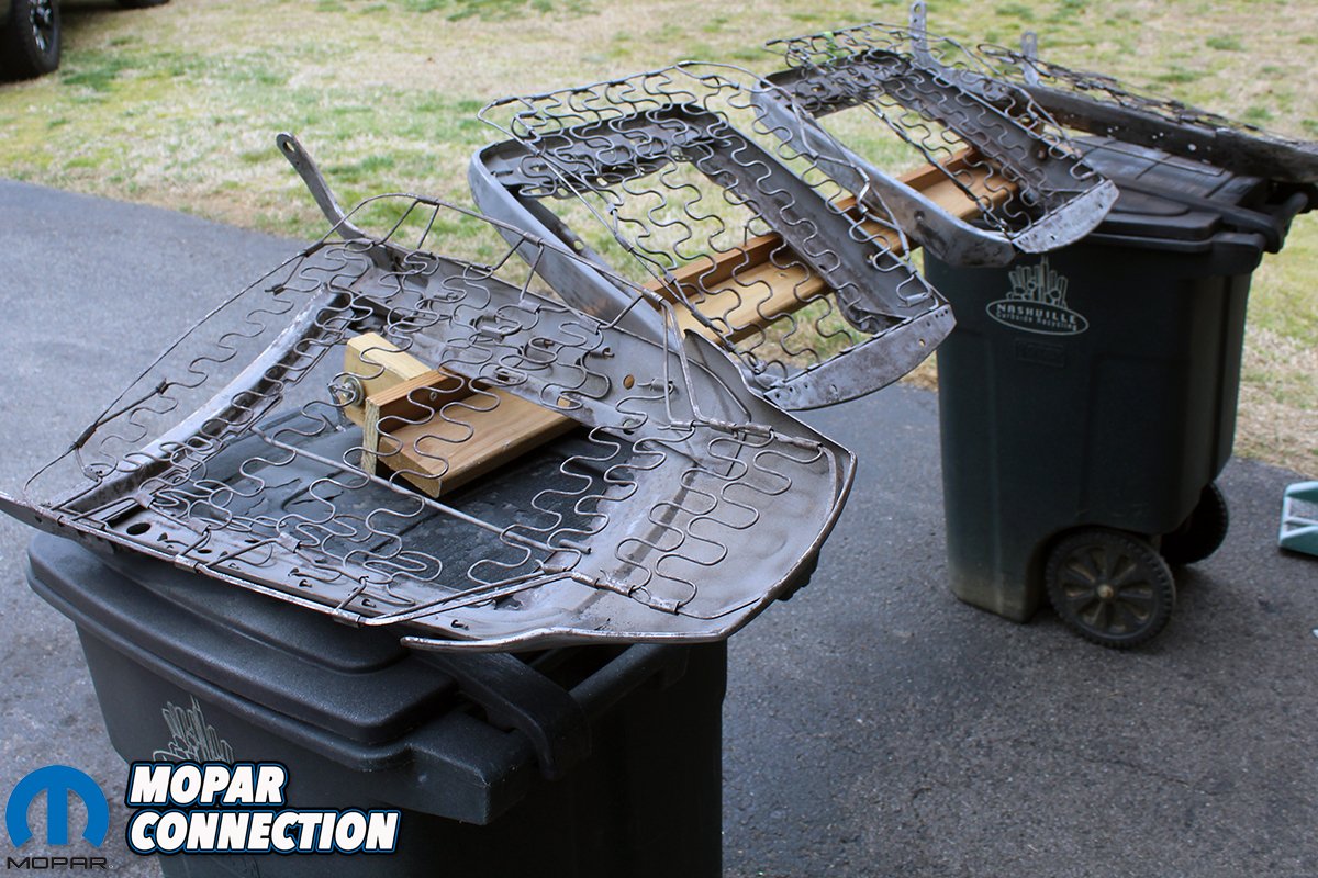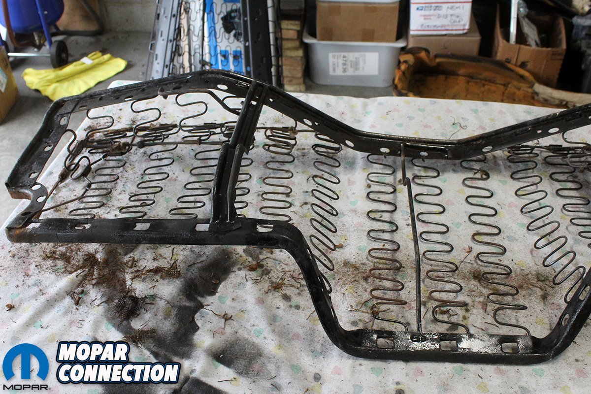 Above left: We looked for a replacement lower rear convertible seat without any luck. Anything we found was rusted badly. So, after the original frame was stripped and painted, we noticed the bend was really not that bad and the frame was rust free. Above right: After we spent some time pushing and pulling on the frame we were able to get the frame straight and ready to be recovered in new burlap, foam, and upholstery. Best of all no rust!