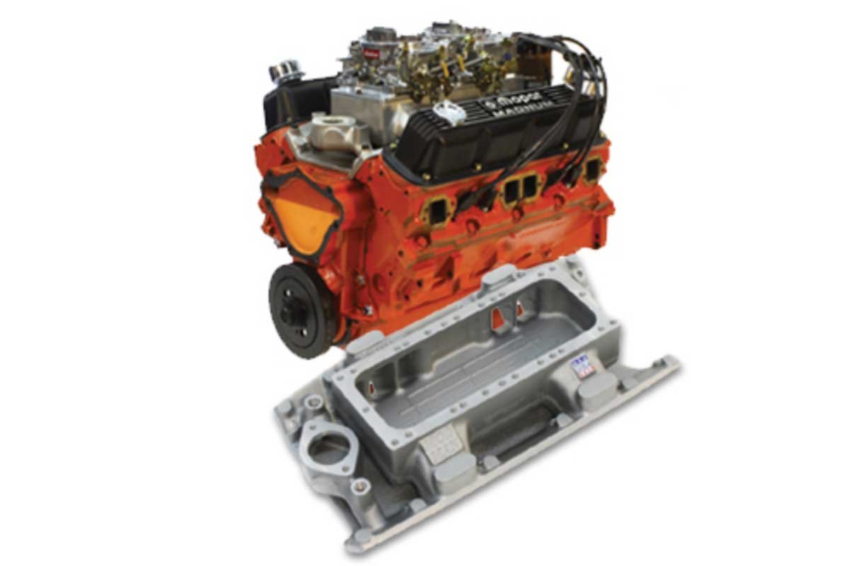 In addition, the crate engine comes with Indy MA-X cast iron heads, a hydraulic roller camshaft, MP valve covers and intake, and a 600 CFM Edelbrock carburetor. Upgrade options for the 360 include larger intake valves, an 8-quart oil pan, two flex plate options, a mini starter, and additional chrome and billet components.
