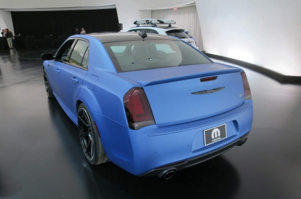 Other Mopar performance upgrades plucked from Mopar’s performance parts catalog and used on the 300 Super S are the front and rear performance strut tower braces, cold air intake, cat-back exhaust, coil-over suspension and a big brake kit. You can buy these parts at your local Dodge dealer. For this concept 300, Chrysler designed custom upper and lower grilles with more than 300 miniature Mopar “M” dots! They also installed a set of seven spoke 22-inch rims and a rear deck-lid spoiler closely resembling the 2012-2014 SRT’s spoiler. If you look closely, you will see the front and rear bumper fascias are the same as the export market 2015 SRT 300. The interior of the Super S is classy and features full Katzkin brand leather and an endless supply of blue stitching!