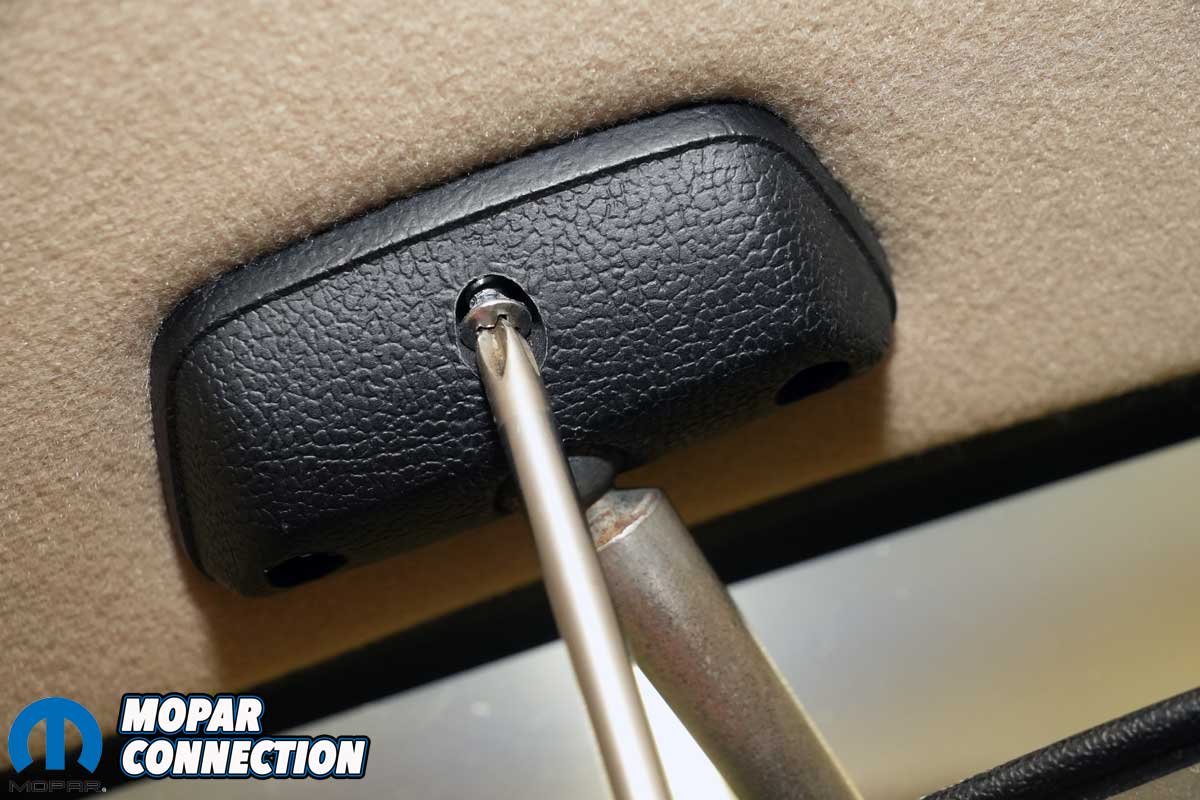 Above Left: Three screws retain the mirror base to the roof of the Dart. Above Right: After unthreading the screws, we removed the base from the headliner.