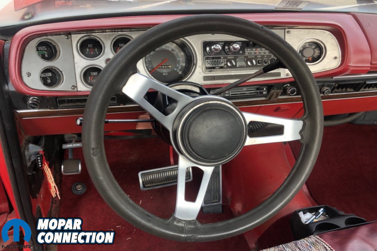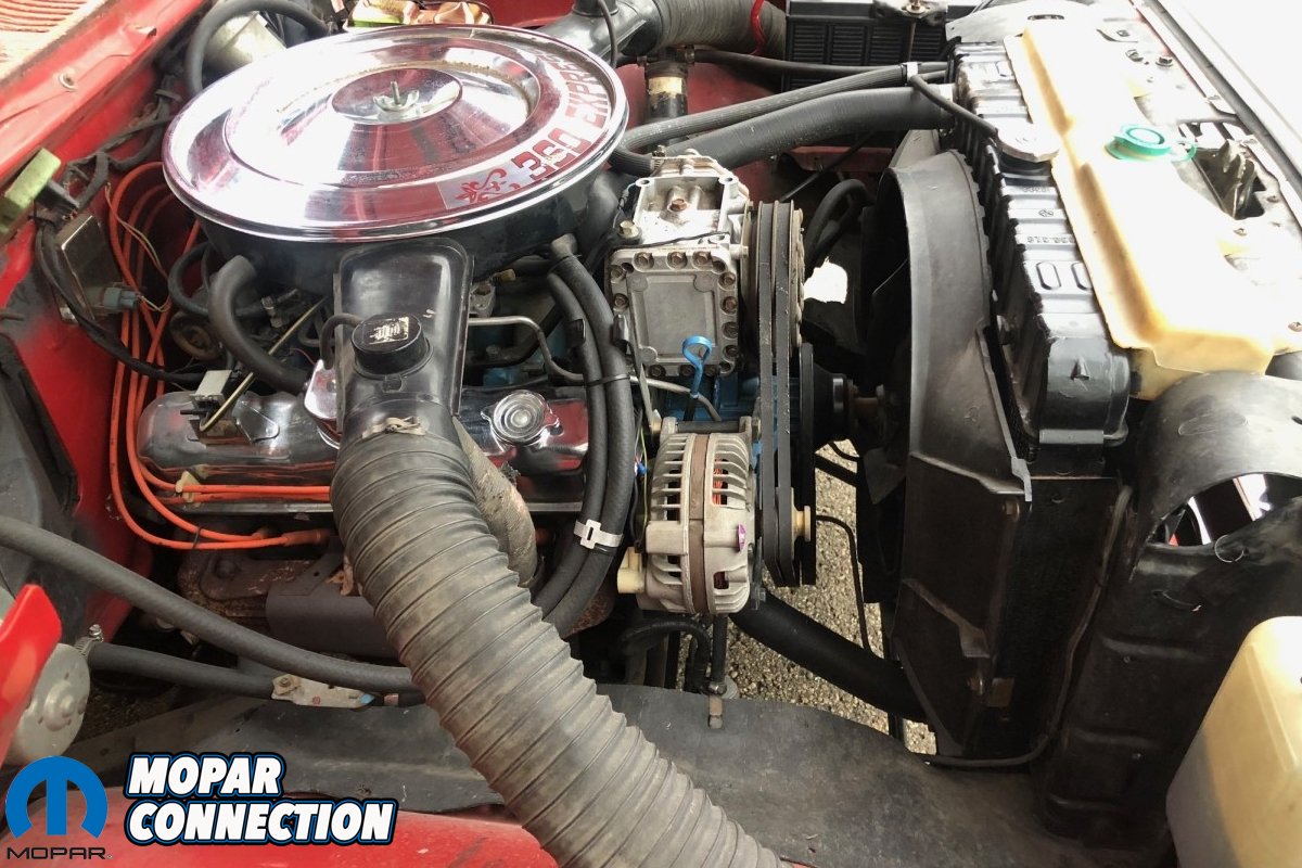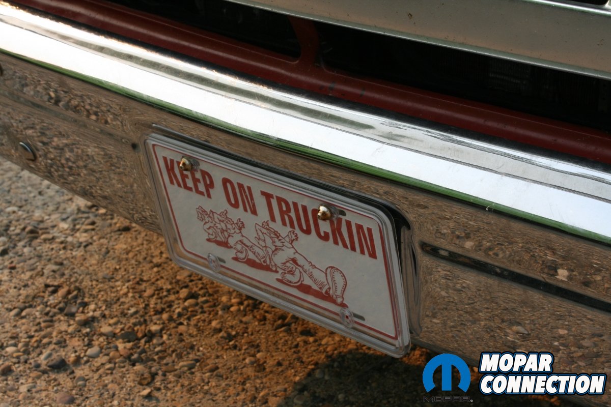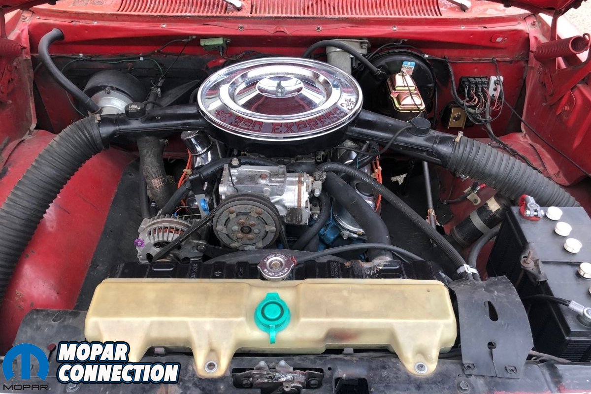 The Lil’ Red Express trucks were truly a special package with their Medium Canyon Red paint, dual chrome exhaust stacks, staggered chrome five-slot wheels, wide tires, wood grain accents and vibrant gold decals. Under the hood, the 360 was dressed up with chrome valve covers and a chrome dual snorkel with long vacuum hose like duct work that fed fresh air into the 360 from the radiator support. The engines were basically modified police units fitted with a 340 camshaft and valve springs along with a bunch of premium police-spec parts. A big Thermoquad four-barrel carburetor fed fuel to the small block.