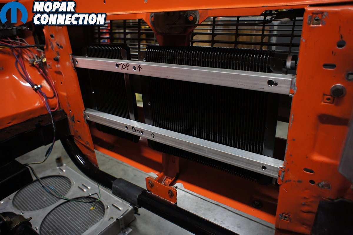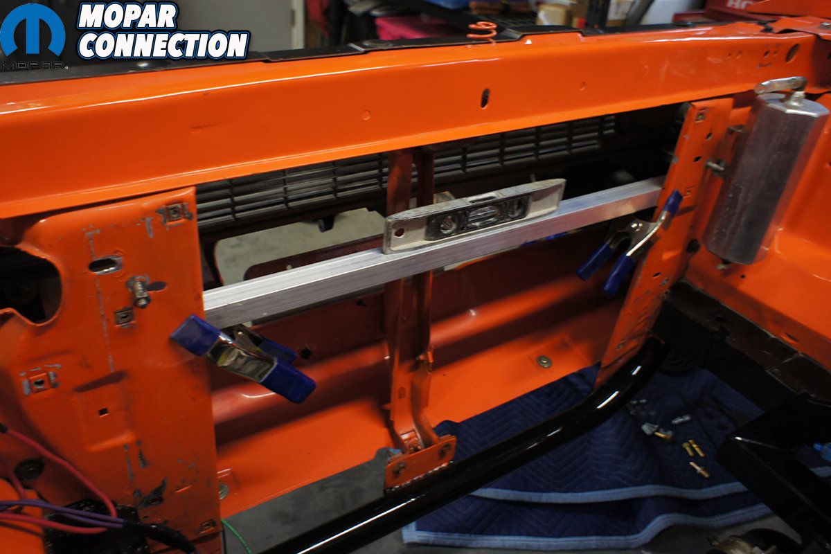 Once we had our bars cut to the correct length, the next step was to figure out exactly where we were going to drill the bars for the coolers and mounting location on the car. To get the bars to lay flat against the core support we had to notch out the small factory lip that sticks up about 1/8th-inch. This allowed the bars to sit flat and secure against the radiator core support. Using a level we made sure that both bars stayed level and clamped them into place while we drilled holes through the core support and bars.