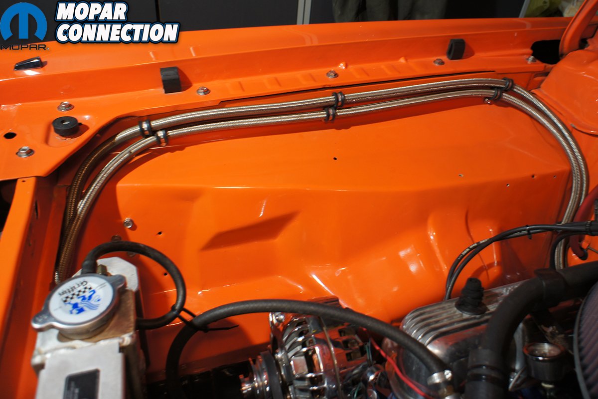 Above: Although the B&M Racing Supercoolers come with all the rubber hoses and fittings necessary to complete the installation, we opted to step up our game with some steel braided line and AN fittings. Here you can see how we routed our oil cooling lines to the filter (mounted behind the passenger headlights) and cooler.