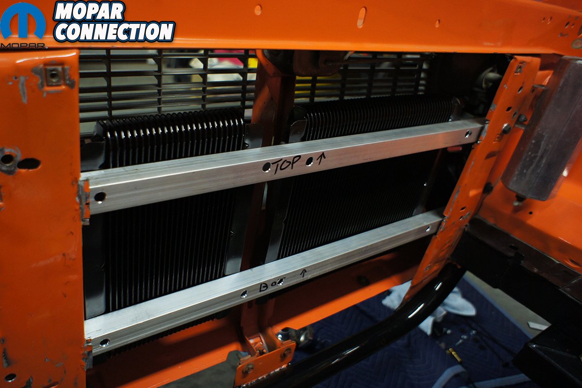 We drilled the top bar first so we could mount the coolers and make sure the bottom bar was in the correct place. Once the top bar was bolted in, we held up our coolers to the bar and adjusted the bottom bar to make sure that we would be close to the center of the bar when we drilled the next set of holes. Once the bottom bar was drilled, we bolted them into place. With the bars in place, we clamped the coolers down to make sure that everything would clear the grille, radiator and core support.