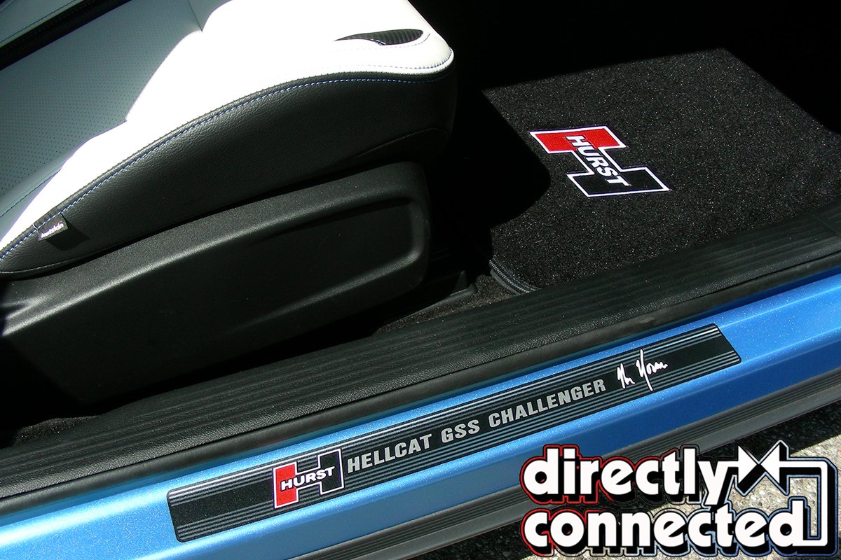 Above left and center: Details abound in the interior, including the plush Hurst embroidered logo carpet mats and custom Hurst Hellcat GSS sill plates that feature the iconic Hurst logo and Mr. Norm’s signature. Above right: The interior of the Hurst Hellcat GSS is, without a doubt the most luxurious interior ever fitted to a Challenger. Created by the artisans at Katzkin, this Hurst Hellcat GSS features their finest Tuscany leather accented with Pearl facings, Hurst logos on all four seat backs, perforated inserts and Viper red top stitching. The detail in the interior must be seen to be believed, and echoes the level of quality you would expect to see in a Ferrari or Porsche.