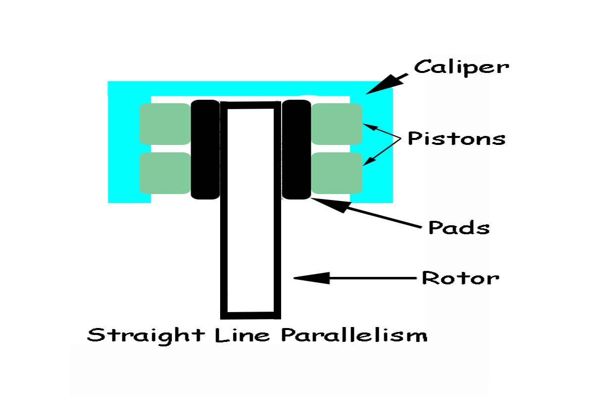 Above Left: As a vehicle travels in a straight line, the brake pads and rotor are parallel with one another (or should be). The pistons and piston seals of the caliper maintain the pads near the rotor. Above Right: When lateral forces from cornering are induced, pad knockback can occur. Rotor runout or component flex causes knockback, which pushes the pistons back through the piston seals and into its caliper bore when the brakes are released. When the brakes are applied at the next corner, the brake pedal will drop closer to the floor as the pistons must travel a greater distance before the brake system pressure begins to build up.