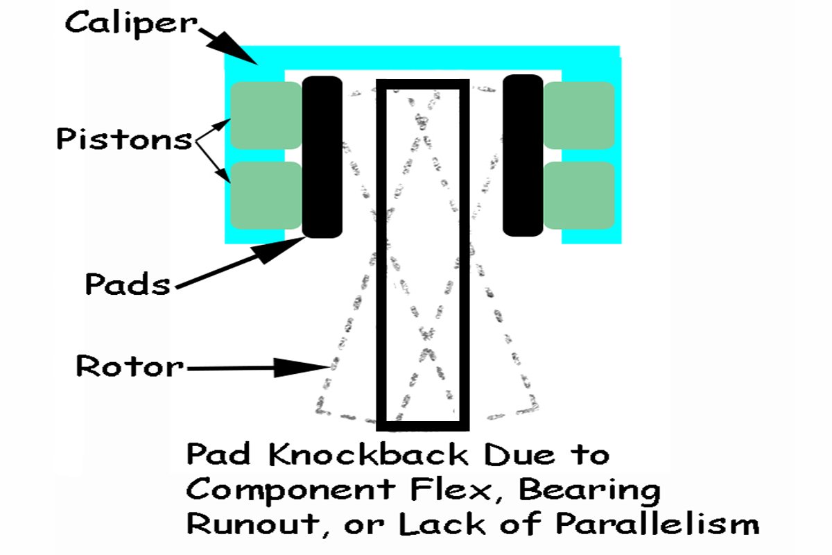 So, what is knockback? As a vehicle travels down a street in a straight line, the brake pads and rotor are parallel (or should be) with each other, if the brakes and suspension are in proper operating order. The pistons and piston seals of the caliper maintain the pads near the rotor. When the brake pedal is applied, there is a rapid pressure build-up in the braking system because the pads are in contact with the rotor. However, if the vehicle is thrown into high-speed turns, lateral loads are created in the chassis. These turns cause deflections of the tires, wheels, hubs, bearings, and spindles (and additional chassis components). Although the parts seem solid, not one of them on any vehicle is 100% rigid.