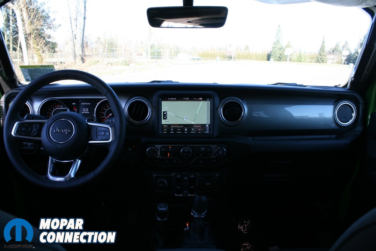 There are USB and media ports galore in the interior. In fact, we counted 7 total; 4 regular USB ports and 3 micro-USB ports along with 12V accessory outlets and a 115-volt AC outlet; a huge upgrade over the minimal amount found in the JK. We also liked the 4 AUX switches found on the dash of the JL which we are sure can be programmed for aftermarket accessories. You no longer have to drill holes in the dash to mount a light bar switch.