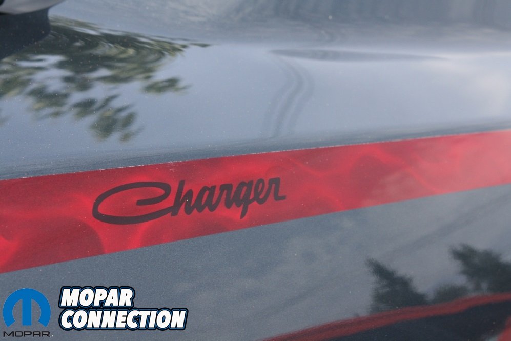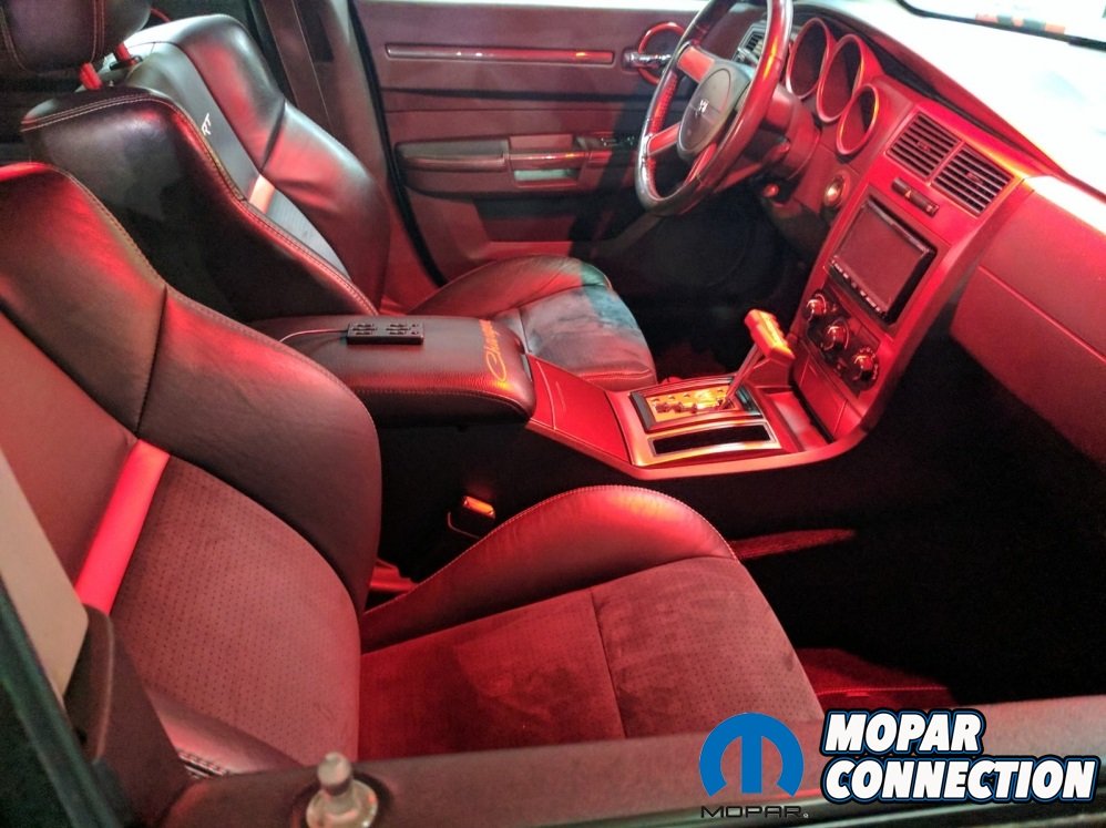 On the exterior of Erik’s Charger, you’ll see the custom paint job by Little Valley Restorations as previously mentioned. Topping off the paint job is custom pin stripping on the trunk by Spiderman Pin Stripping and a gloss black vinyl wrapped roof. The exterior also features a Grip Tuning front fascia, carbon fiber side skirts, color matched front marker lenses, G-Force LED tail lights with custom paint, Advanced Automotive Concepts RGB LED Halos and a 6000k HID kit to light up the night sky. Turning to the inside, you’ll find a custom painted dash and center console, custom made leather arm rest with the Charger logo embroidered in it, Challenger SRT8 seats, anodized red Billet Technology door pulls, T-handle shifter and shifter insert plate and Advanced Automotive Concepts White LED interior lighting.