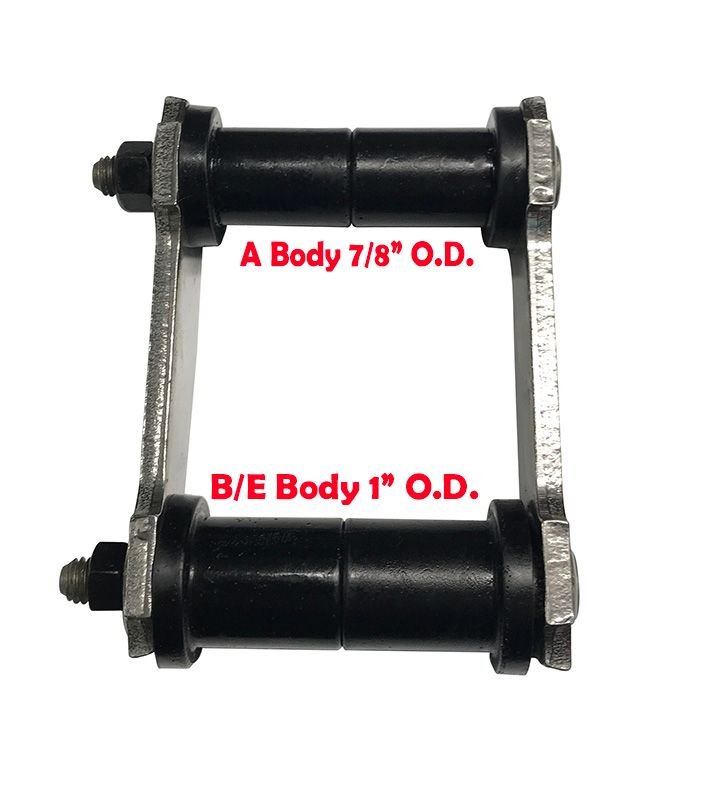 B and E-bodies were factory-fitted with 1” shackle bushings while the smaller A-bodies received correspondingly-smaller 7/8” pieces. Mancini’s new conversion shackle and bushing sets make up for that difference to allow the performance-minded to install short segment A-body springs in B/E-bodies.