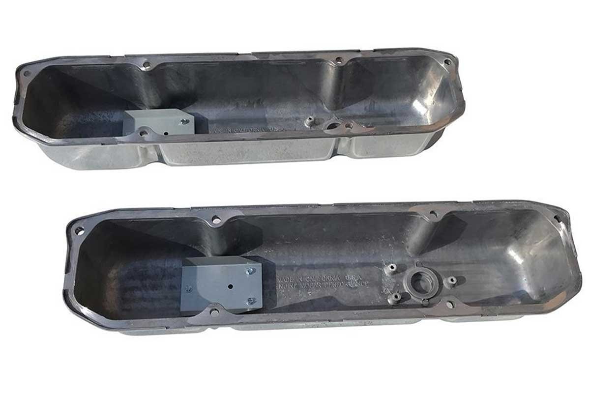 Above Left: When Chrysler changed the name of its performance division from Direct Connection to Mopar Performance, many Mopar enthusiasts slipped off the DC valve covers and installed new MP valve covers. The covers came in painted black or polished aluminum. Mancini has a supply of polished aluminum big-block covers. Above Right: The valve covers come with bolt-in oil baffles. The gaskets, grommets, and oil fill caps can be purchased separately from Mancini Racing.