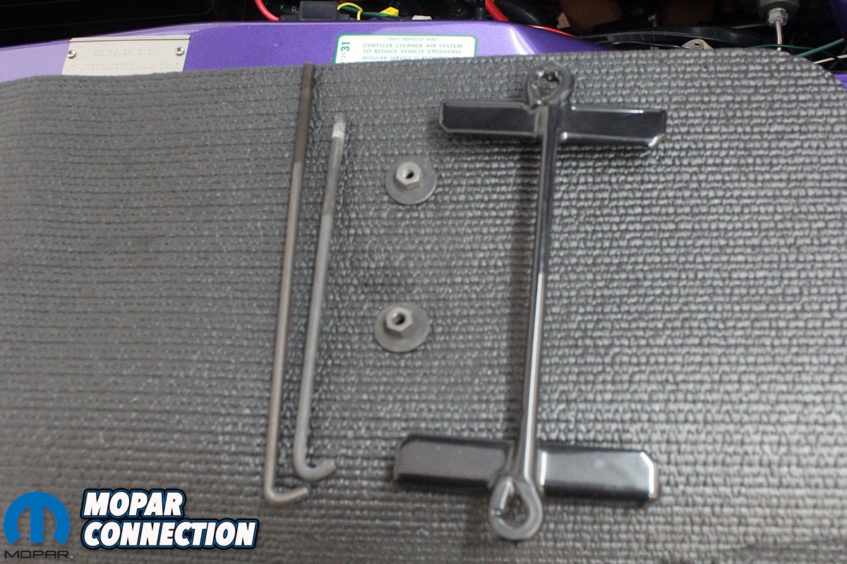 Above left: We then closely examine the side casing. Same as the top everything was correct. A quick wipe of Meguiars “Natural Shine” dressing and it is ready to install. Above right: Since we already had the correct battery hold down hardware from Frank Badalson it was an easy install. Notice the correct finish on the battery hold down posts, nuts, and rubber coated bracket. Yes in 1969 the hold down bracket had wing nuts, but in 1970 ‘Ma Mopar went with shoulder captive washer nuts.