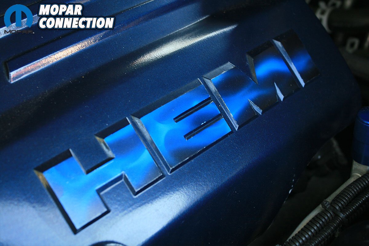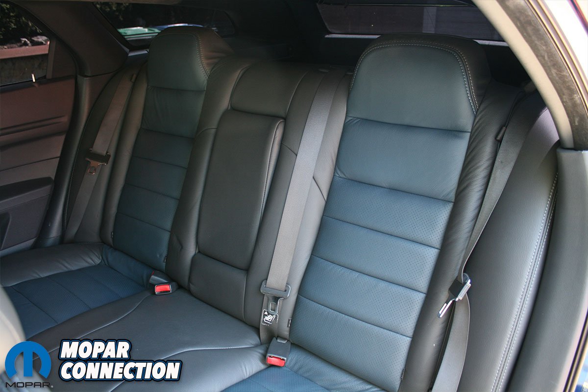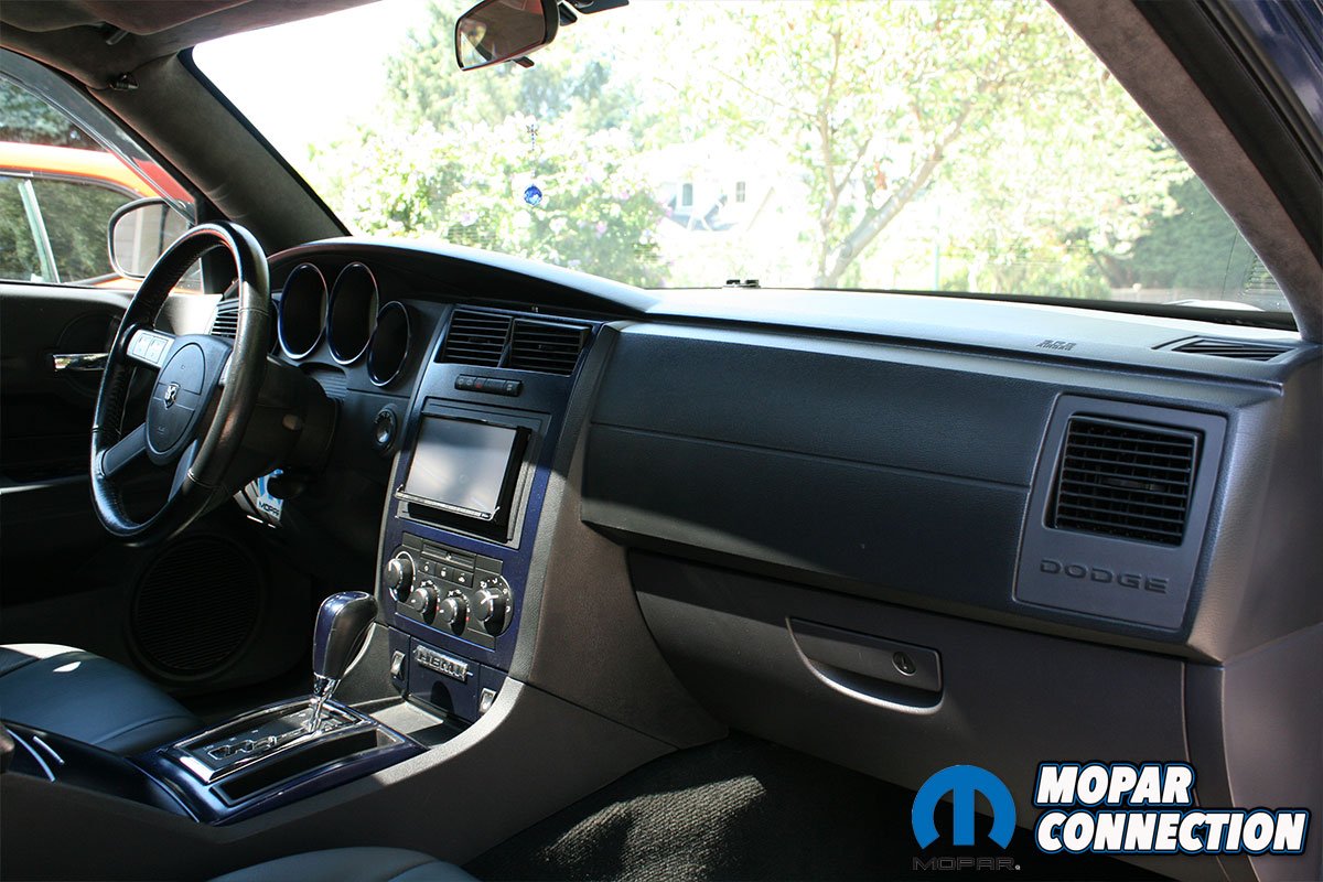 On the outside, the Magnum still features its stunning Midnight Blue paint. It has been accented with a sleek satin black upper body black-out. It features a Danko front chin spoiler, T-Rex billet upper and lower grilles and Hotchkis quick release hood pins. Out back, the rear lift gate has been shaved for a clean look. The silver R/T headlights have been changed out for a pair of black SRT headlights.